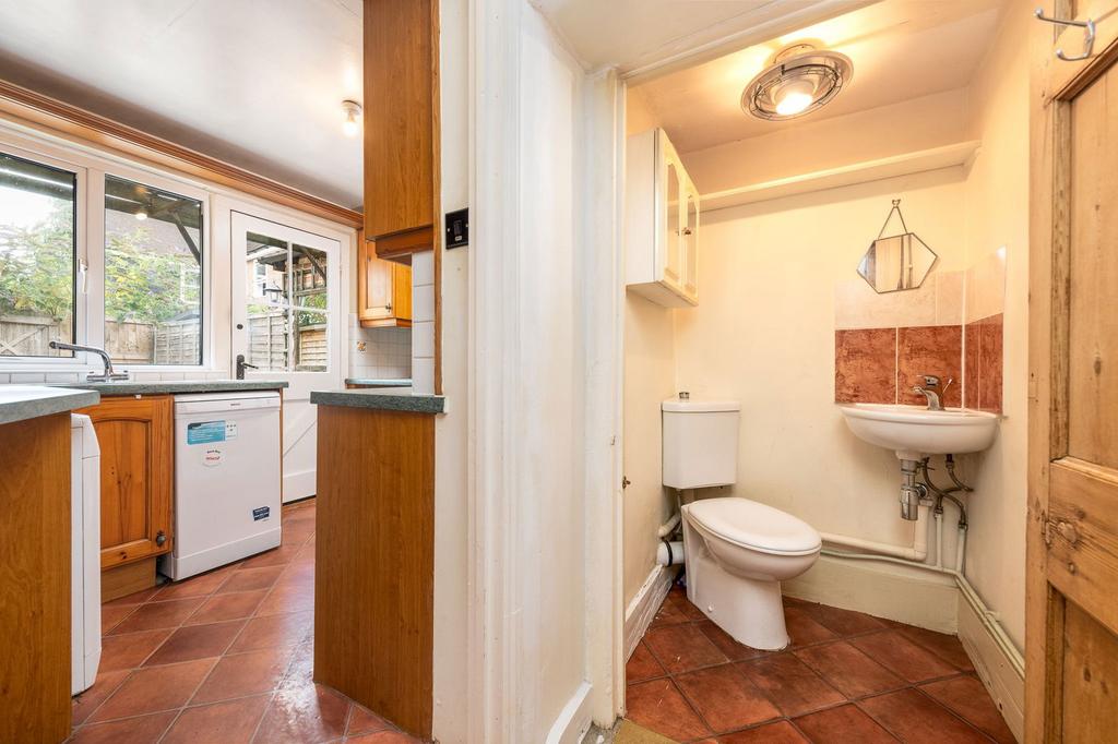WC. Hand wash basin. Cupboard. Tiled flooring.