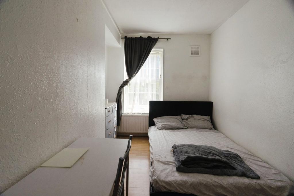 Living/Dining Room - Bright and spacious reception room offering generous space for furniture for both living and dining purposes (currently also housing a double bed), with multiple double glazed windows including a bay allowing additional space and ample natural light, wood effect vinyl flooring, two radiators and recessed spaces.