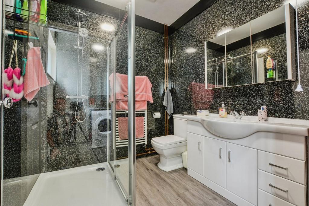 The main bedroom, features a radiator, exposed brick feature wall, and a large walk-in wardrobe/storage cupboard. Bedroom two also includes a radiator, a large wardrobe, exposed brickwork, and a ceiling light point. The stylish refitted shower room is splash-panelled throughout and comprises a double-sized shower cubicle with mixer shower, a hand basin set in a vanity unit with toiletry storage, a close-coupled WC, ladder-style towel rail, extractor fan, laminate flooring, and two ceiling lights.