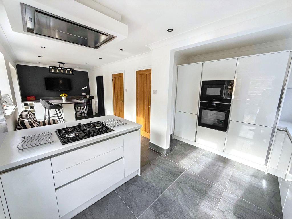 Open plan to the rear of the property with a double glazed window, French doors and external door all leading to the rear garden. The kitchen is recently refitted with a modern, sleek, high gloss fitted kitchen with a range of wall and base units and quartz worksurfaces, integrated appliances, a double oven, gas hobs and extractor, spot lights to the ceiling and tiled floor throughout.