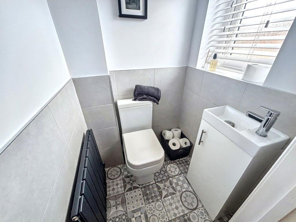 A double glazed window, towel rail, low level wc, vanity wash hand basin, tiled walls and floor.