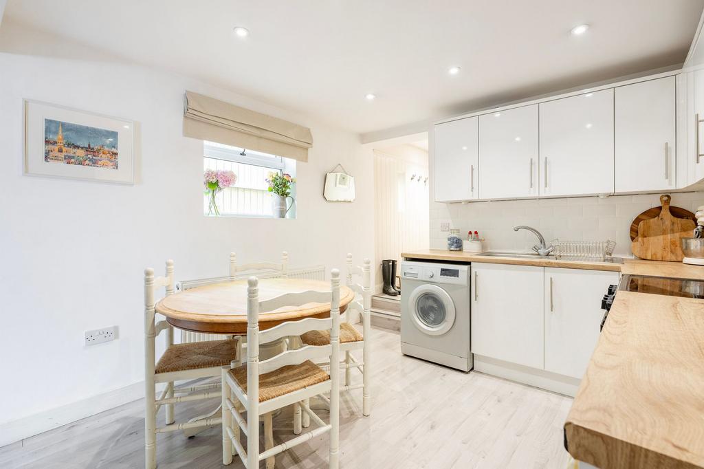 An open archway flows effortlessly into the kitchen-diner, where sleek, modern cabinetry is paired with wood-effect surfaces for a warm, contemporary feel. This space is both practical and inviting, ideal for preparing meals or enjoying a quiet breakfast. Just off the kitchen, a small lobby area provides a handy nook for coats and boots, and a door leads out to the rear garden.