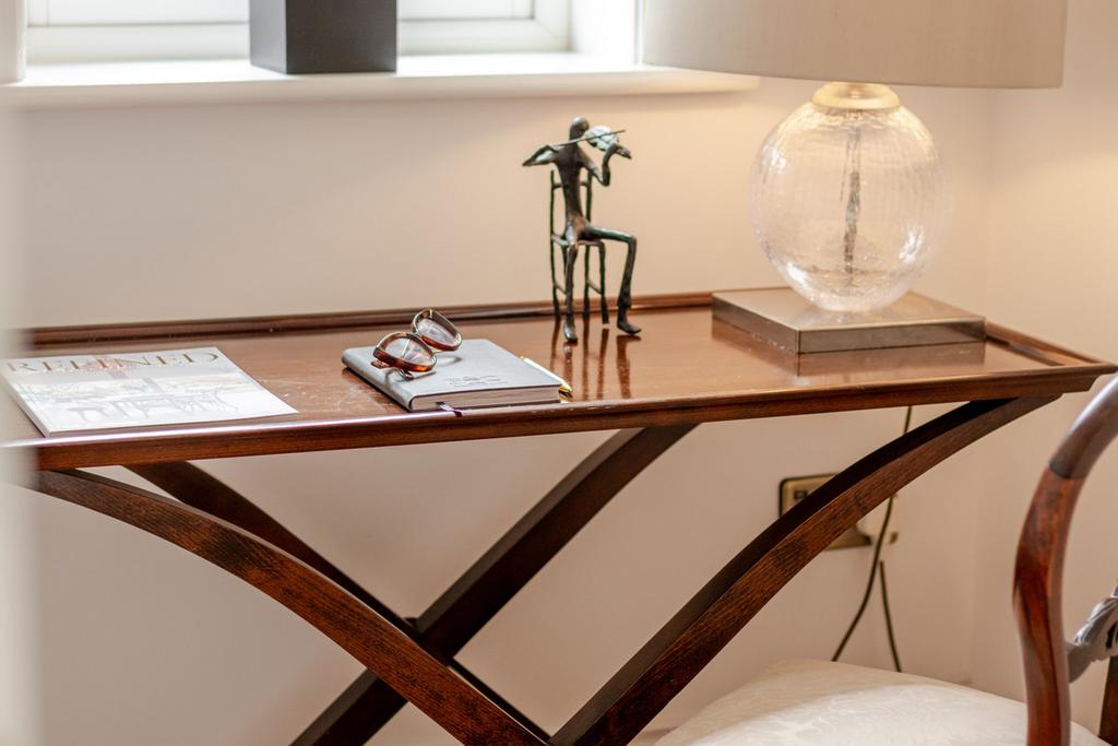 A handcrafted oak front door, created by a local master craftsman, sets the tone for the home’s exquisite interiors, with beautifully turned wooden handles, herringbone oak floors, and elegant brass and steel accents. The hall opens into a striking lantern-roof hallway awash with natural light, leading to a study with herringbone oak flooring. The inner hall, featuring fully tiled granite flooring from the front door through to the bespoke oak staircase, gives access to a cloakroom and understairs storage.