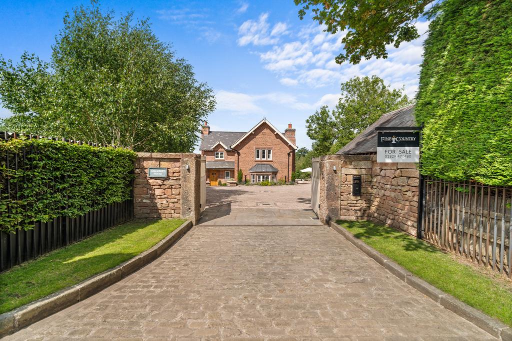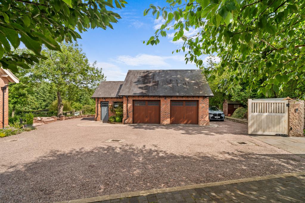 Hallcroft House is approached from the main road in Tilston along a private drive, owned by the property, and sits behind beautiful electric wooden gates. As the gates open, a large gravelled driveway leads to a detached double garage with an attached store room and a first floor. This could easily be reimagined, subject to the necessary planning consents, as a separate annexe, home office, or au pair suite. The driveway offers parking for 6–8 cars. A single wooden gate and a secondary double gate provide additional access to the sunken garden, and there is also a parking area owned by Hallcroft House to the side of the gates.