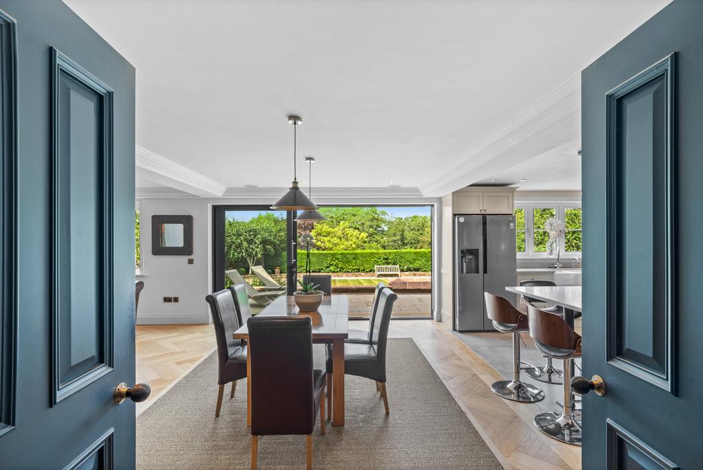 The kitchen features a bespoke range of cabinetry, integrated appliances, a double Belfast sink, Quooker tap, larder unit, plumbed American fridge/freezer, and a fabulous central island/breakfast bar with pale beige quartz worksurfaces. French doors open to a side patio—perfect for breakfast and supper. This incredible family room also has in-ceiling speakers, ideal for soft background music or entertaining. The dining area looks directly out through the sliding doors, while the family sitting area, with its wood-burning stove, creates a welcoming focal point. A laundry/utility room with a side door to the garden completes the practical elements of the ground floor.