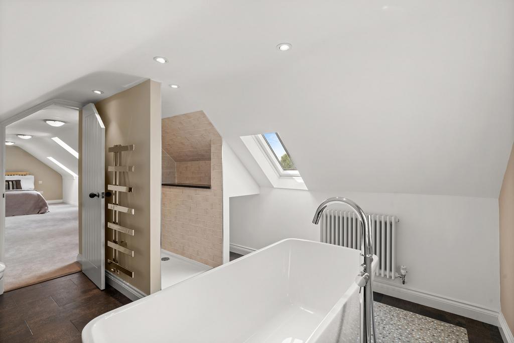 The oak staircase continues to the second floor, comprising a fifth bedroom with eaves storage and a luxurious ensuite bathroom featuring a central elliptical bath, freestanding chrome taps, and a large walk-in shower. This level offers an ideal retreat for a teenager or an oasis for multi-generational living.