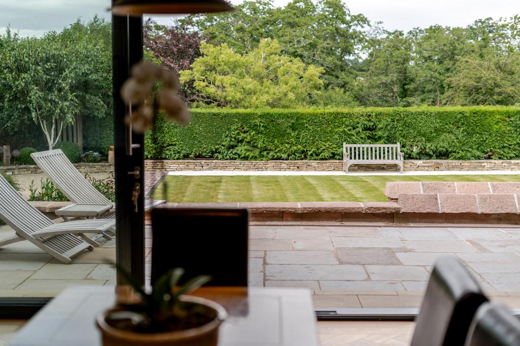 Every corner offers a beautiful view, with a pony paddock to the side and open fields beyond. Feature lighting illuminates the trees and shrubs, transforming the gardens at night. Over the sliding patio doors hangs a charming triple lantern, casting a warm, welcoming glow across the rear of the house.