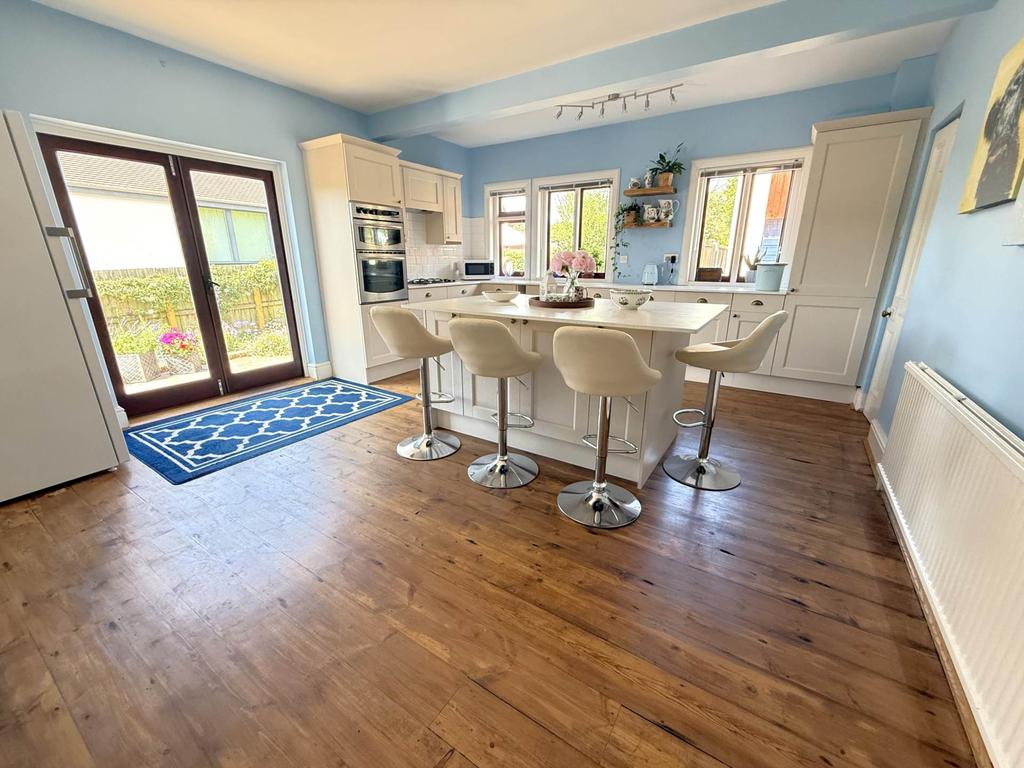 A stunning room that again enjoys a dual aspect with three windows to the rear and double opening glazed doors to the side. The kitchen was installed in early 2025 and comprises of an excellent range of floor standing and wall mounted cupboard and drawer storage units with attractive quartz works surfaces and tile splash backs above. Large matching central island with additonal storage cupboards and a breakfast bar. Inset single bowl sink with an integrated drainer unit to the side and a mixer tap above. Built in four ring gas hob with an extractor hood above and a double electric eye level oven and grill to the side. Integrated dishwasher. Wall mounted, concealed, gas boiler. Exposed floorboards. Space for free standing fridge / freezer. Large and useful walk in pantry cupboard with shelving to one side, wall mounted coat hooks and with power and light connected. Large radiator. Door leading to: