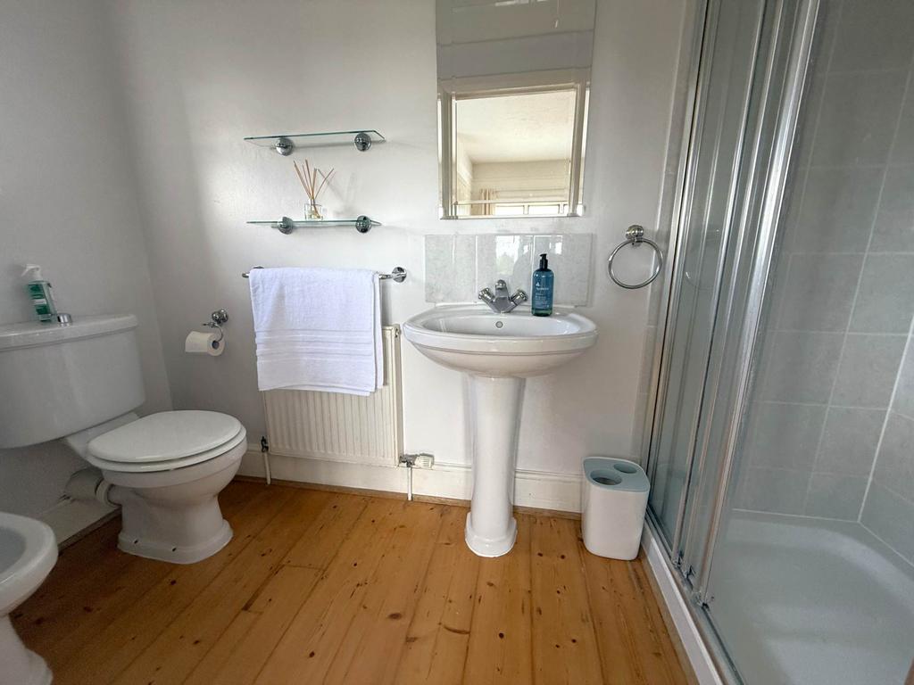 Obscure glazed window to side. Modern fitted four piece white suite comprising of a large walk in shower cubicle that has tiled splash backs to ceiling height, sliding splash screen door and an electric shower. Low level WC. Pedestal wash hand basin. Bidet. Radiator. Exposed floorboards. Inset ceiling lights. Extractor fan.