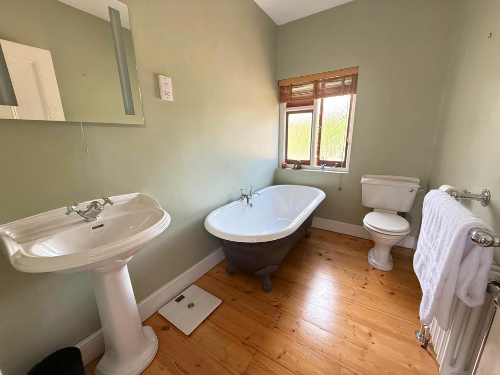 Obscure glazed window to the rear. Modern fitted suite comprising of a free standing roll top bath with attractive claw feet. Low level WC. Pedestal wash hand basin. Wall mounted mirror with LED lighting. Shaver socket. Radiator with heated towel rail. Exposed floor boards. Inset ceiling lights. Extractor fan.