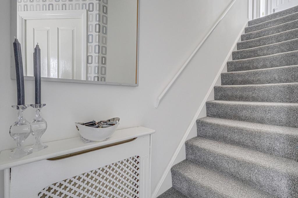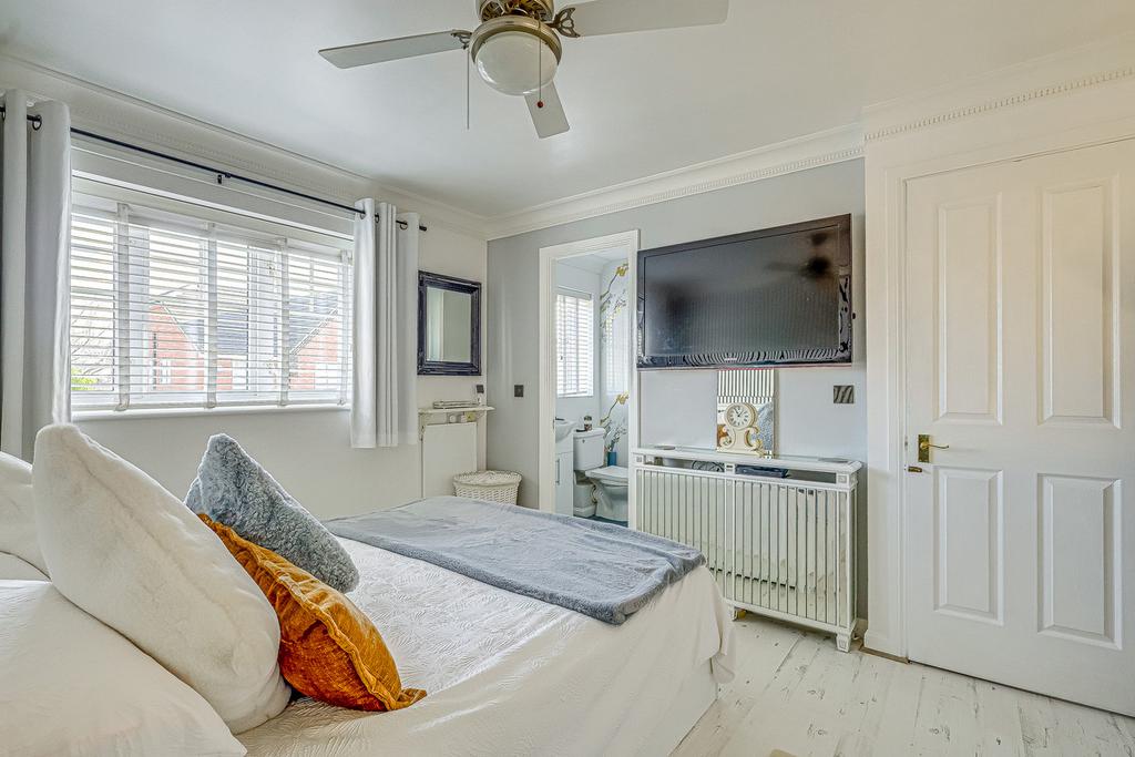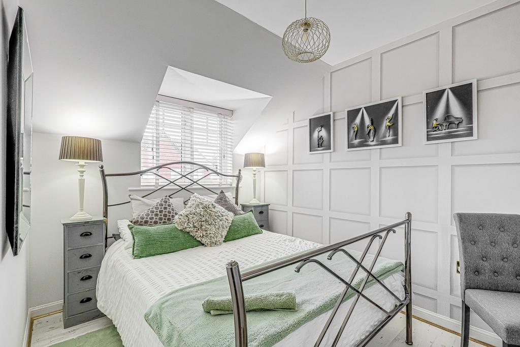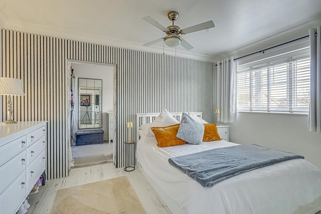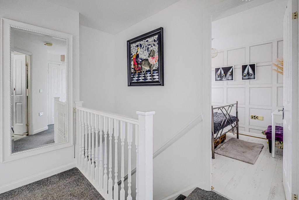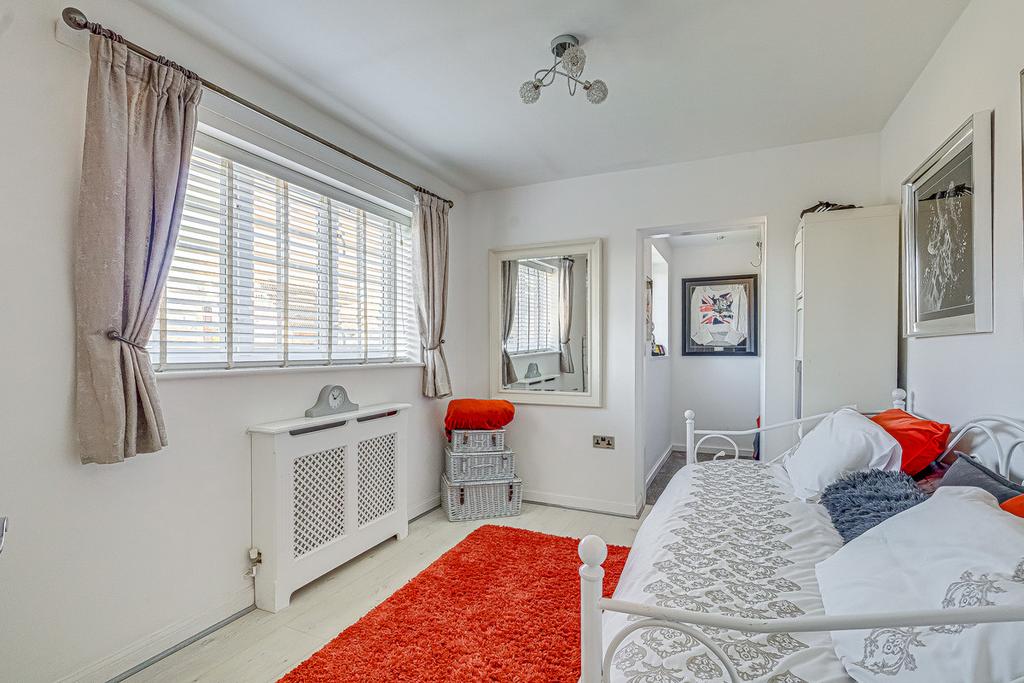 Upstairs, the home offers three generously proportioned bedrooms, including a principal suite with a private ensuite and a spacious dressing room. Bedroom Two also benefits from its own walk-in wardrobe. With some thoughtful remodelling, the dressing room and walk-in wardrobe could be transformed into a fourth bedroom or would otherwise make ideal nursery spaces. A sleek, modern family bathroom serves the remaining rooms, and additional built-in storage is conveniently located off the landing. Each room enjoys abundant natural light and a neutral décor, creating an ideal blank canvas for buyers to make their own.