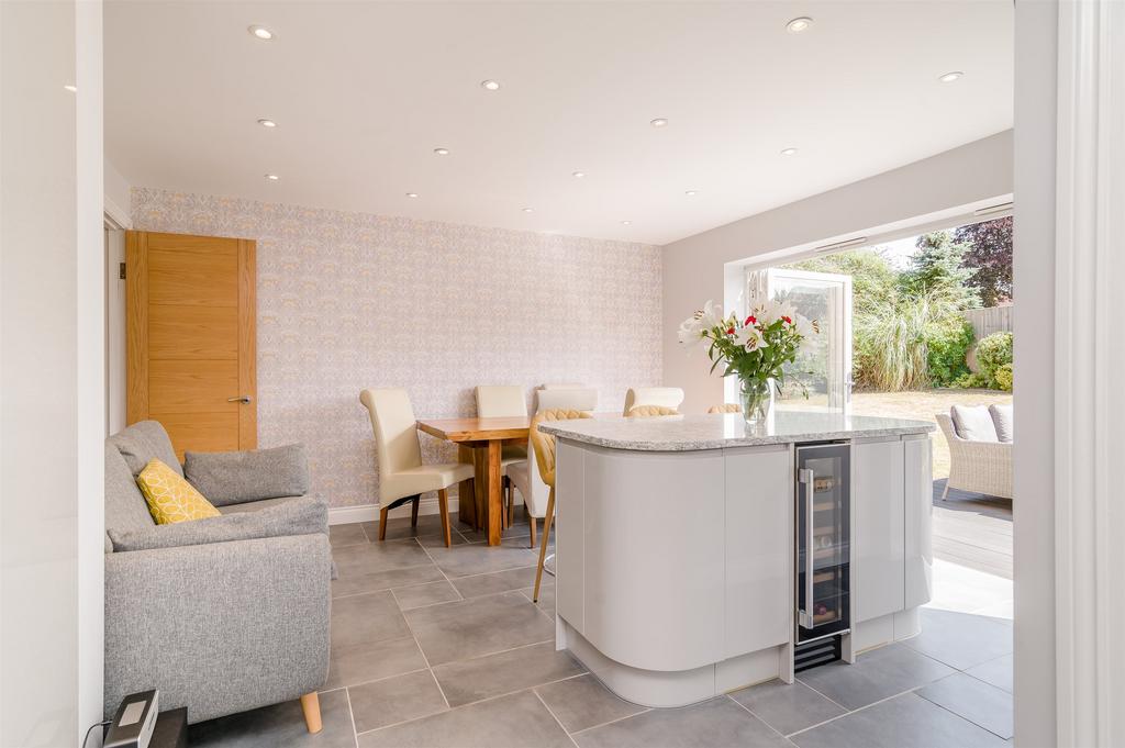 The heart of the home lies in the impressive open-plan kitchen/diner, recently renovated by the current owners to create a stylish and functional space ideal for everyday living and entertaining. This modern kitchen features quality fittings, a separate utility area, and the added luxury of electric underfloor heating. Bi-folding doors lead directly onto the rear garden's decking area, perfect for family gatherings and alfresco dining during the warmer months.