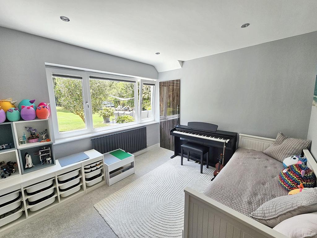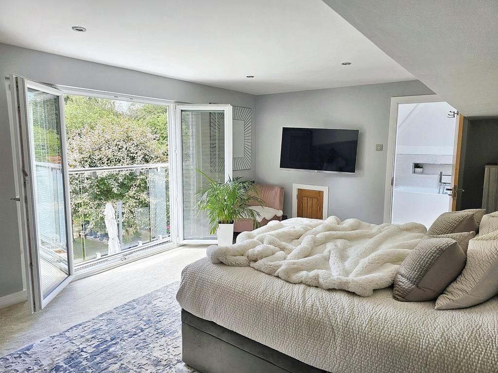Upstairs, the landing branches off to two further bedrooms. The master suite is a true haven, featuring Juliet balcony doors that open to views of the rear garden-where treetops meet the horizon. A spacious luxury en-suite includes a Porcelanosa double-ended bath, contemporary vanity unit, low flush WC, and skylight window. Across the landing, the second upstairs bedroom is also generously sized, with built-in wardrobes and its own stylish Porcelanosa en-suite bathroom, maintaining the same luxurious specification.