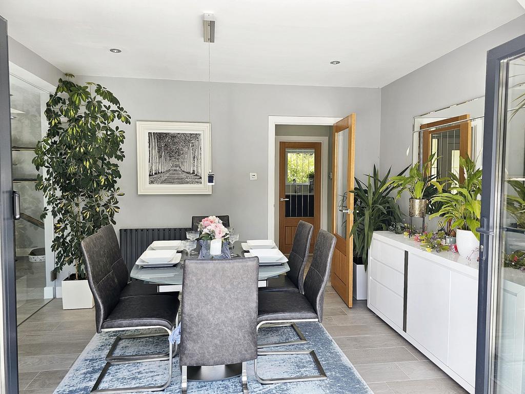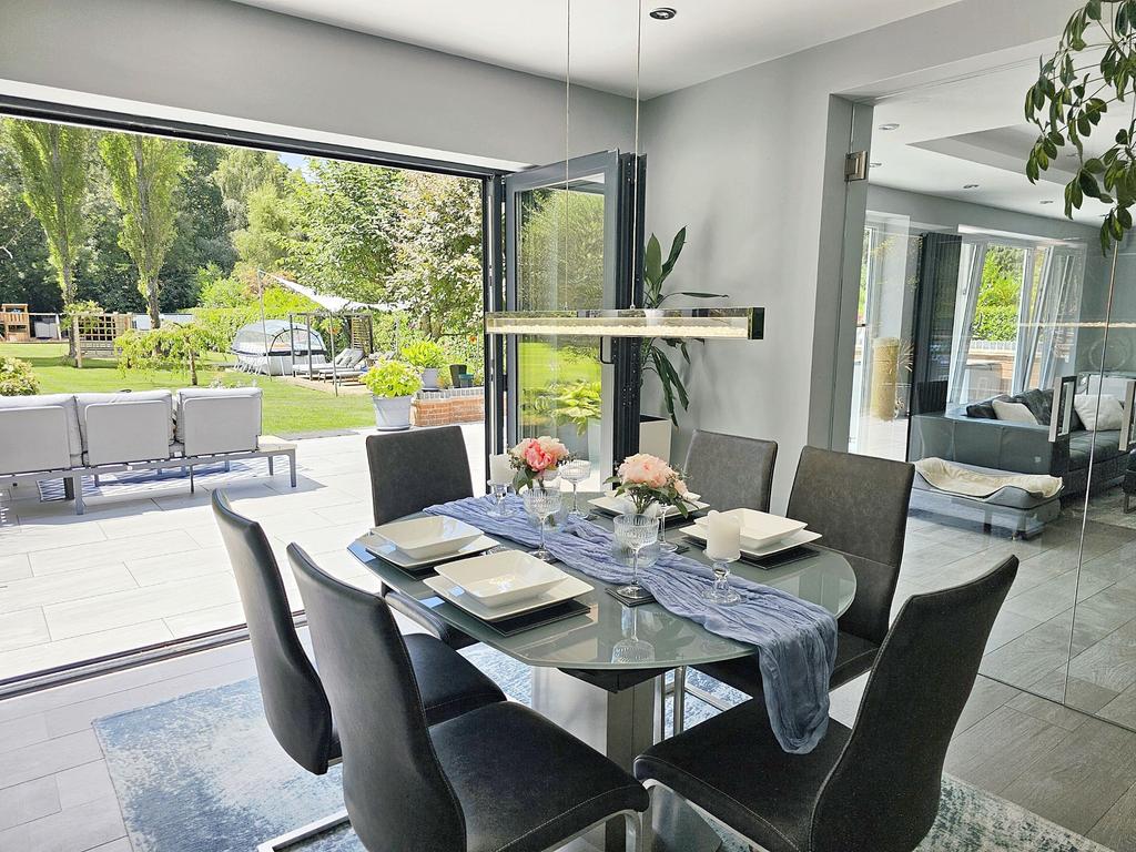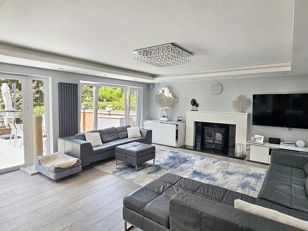 Internally, the property has been comprehensively refurbished throughout. The impressive 34ft entrance hallway instantly sets the tone, leading to a series of well-proportioned and light-filled rooms. The lounge, a cosy yet elegant space, features a cast iron wood-burning stove, perfect for winter evenings, and double doors that open out onto the rear terrace. Full-height internal glazed doors connect the lounge to the dining room, which continues the flow of natural light and provides an open-plan feel when desired. Here, bi-folding doors open directly onto the extensive patio and garden beyond-ideal for summer gatherings.