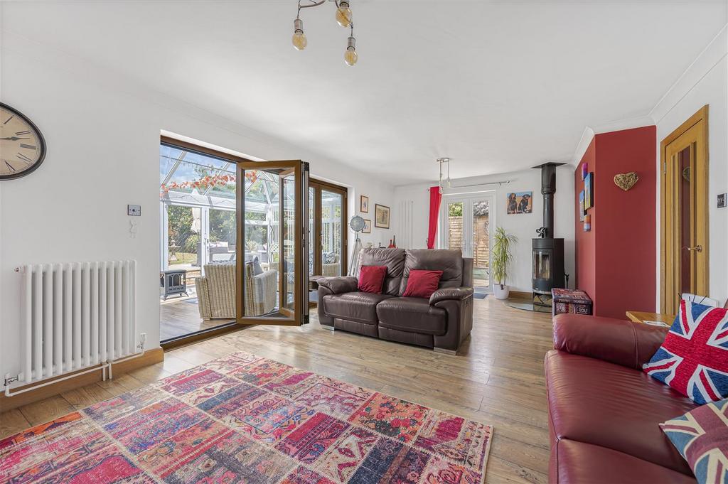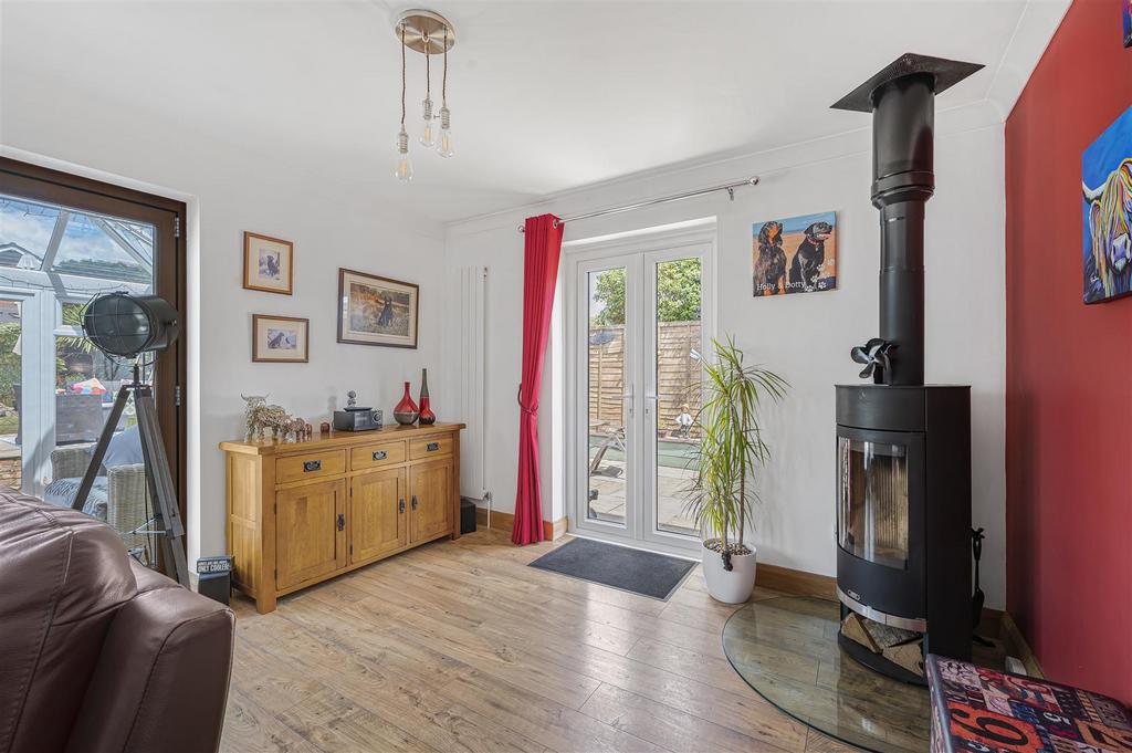 The living room is to the rear and has two radiators, a T.V point, a log burring stove, bi-folding doors to the rear into the conservatory and French doors to the side patio area. The conservatory has full height windows and doors to three sides, two radiators, wall lights and access to the sunny rear garden.