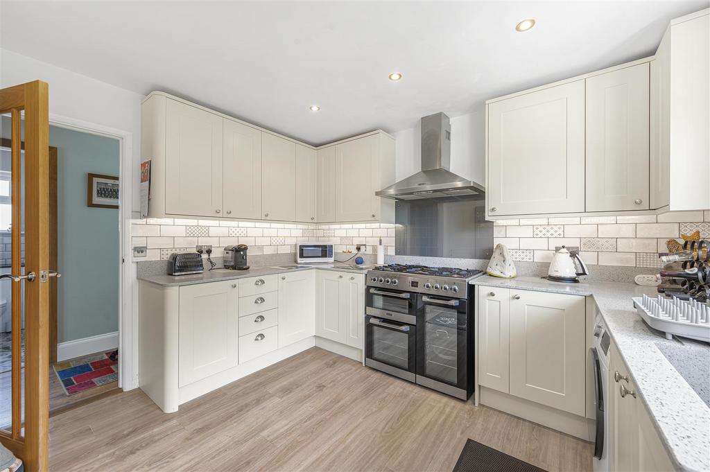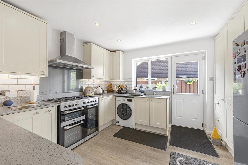 The kitchen has been fitted with a good range of wall and base units comprising an inset sink with mixer taps and cupboards below, there is an integral washing machine, a cooker recess, space for an American style fridge freezer, tiled splashbacks, Karndean flooring and a door and window to the side.