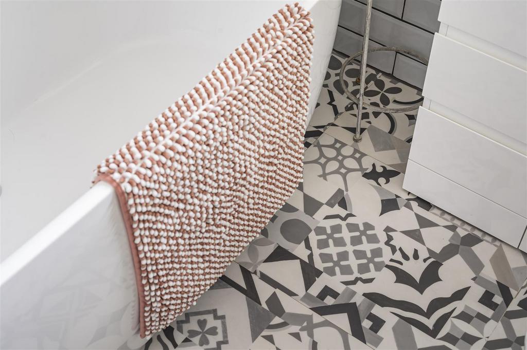 The bathroom has been fitted with a white suite comprising a freestanding bath with mixer taps and a shower attachment, a large enclosed shower with thermostatic shower over, a wash hand basin and w/c set into a vanity unit, a heated ladder towel rail, tiled walls, an extractor fan and windows to the side.