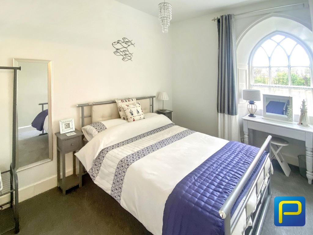 A beautifully proportioned double bedroom with soft carpet underfoot and a standout arched sash window creating a serene atmosphere. Light flows freely into the room, while the recess beneath the window offers an ideal dressing or reading area. Tastefully styled with nautical accents.