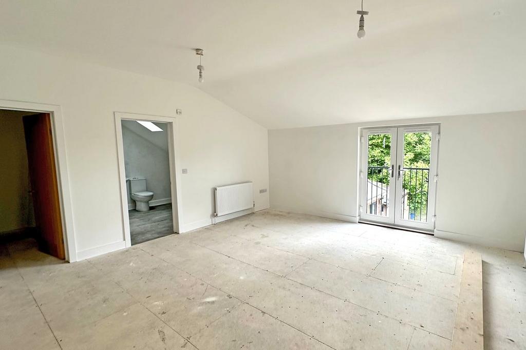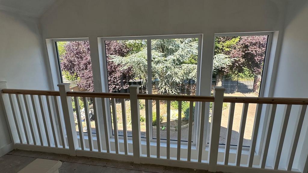 Stairs to Spacious Galleried Landing: Full width glazing to the front, vaulted ceiling, downlighters loft access and radiator.