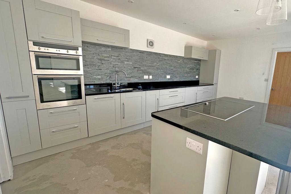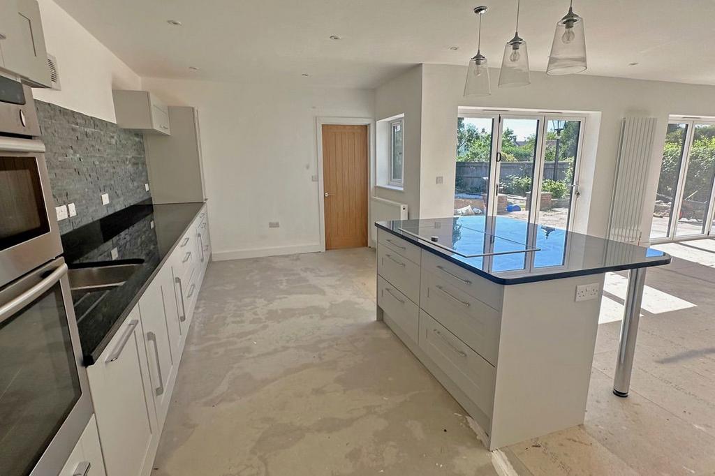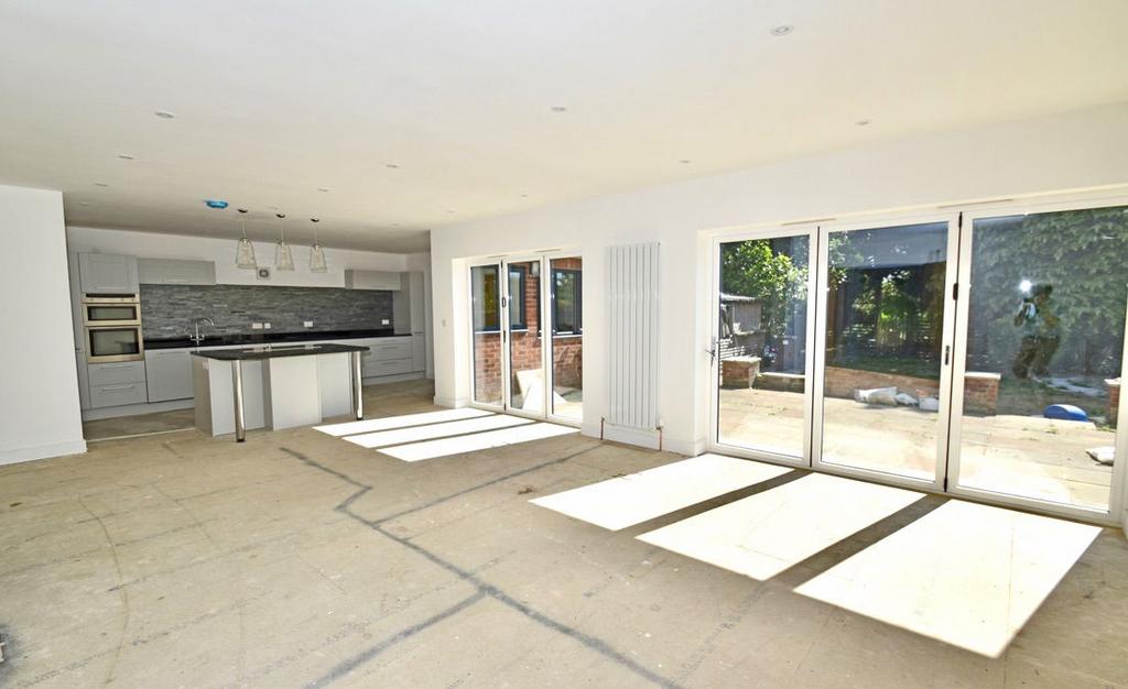 Kitchen/Dining/Living Room: A fabulous open plan space with two sets of bifold doors to the terrace and rear garden. It is fitted with a range of kitchen units, including an island with breakfast bar, polished black worktops and stainless steel sink. Induction hob, double electric oven, dishwasher and fridge. Four radiators, downlighting.
