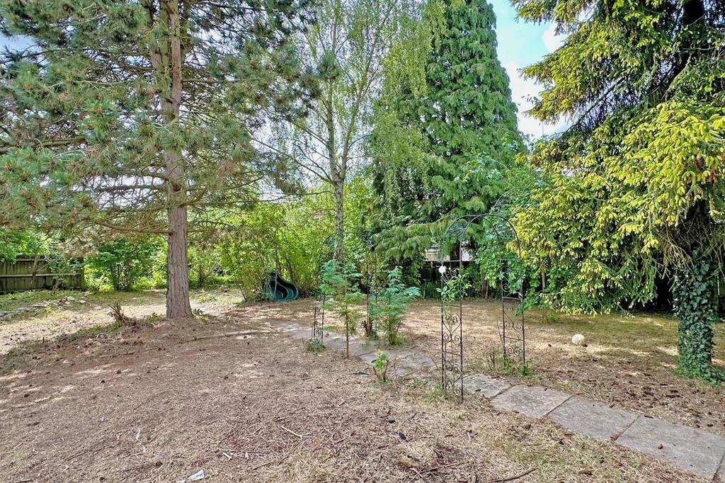 Rear Garden: Terrace area leading to an area of lawn, steps to a further terrace and to the rear garden which is full of established trees and shrubs and a gate, fence dividing the rear from the front and enclosed by timber fencing.