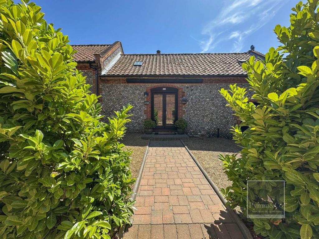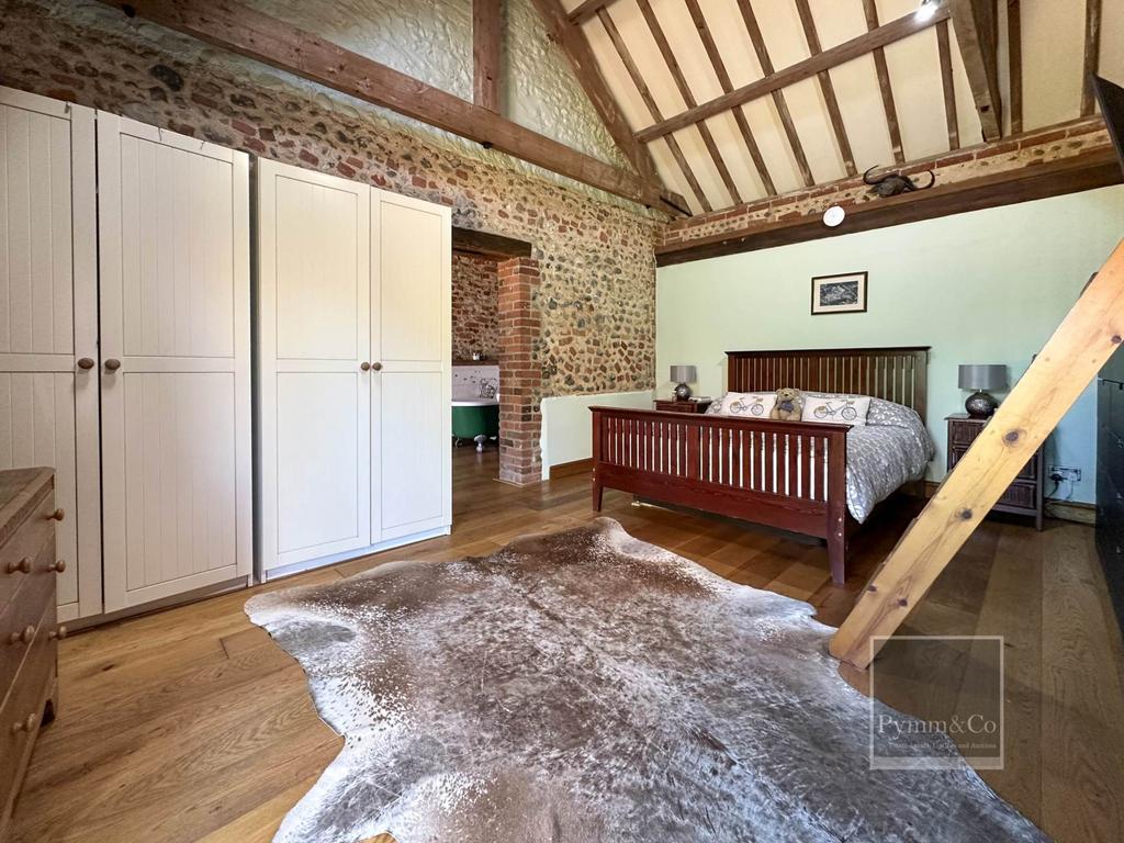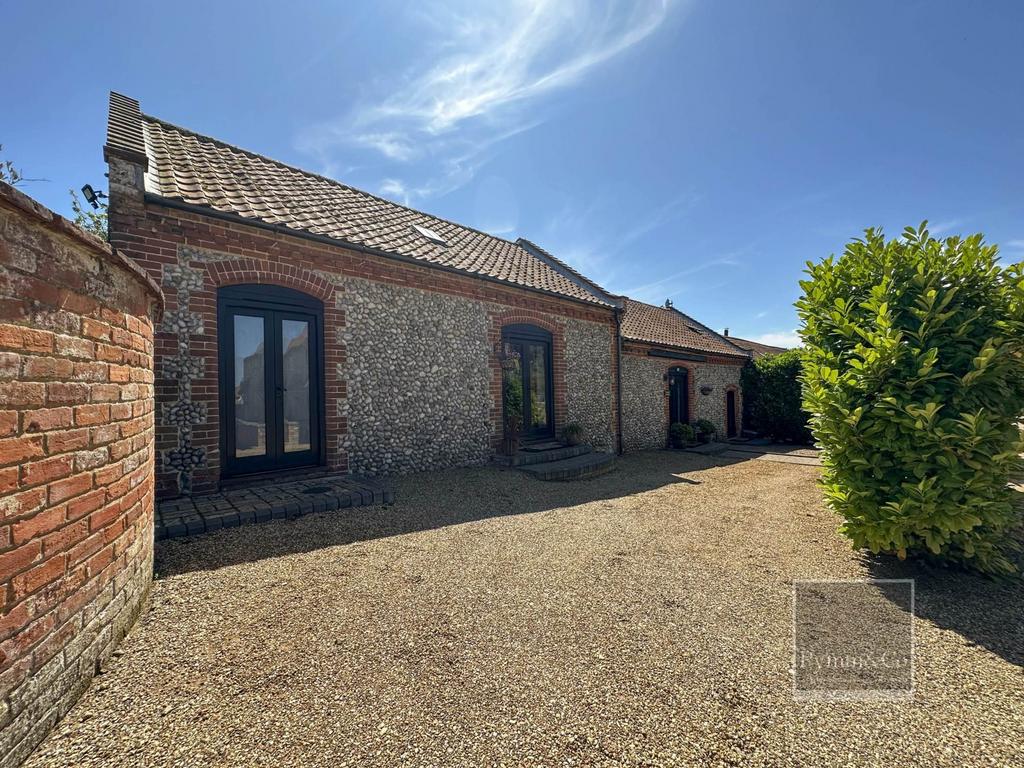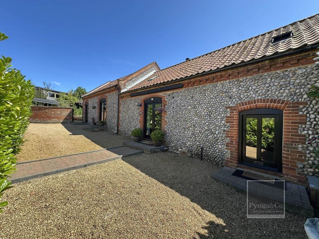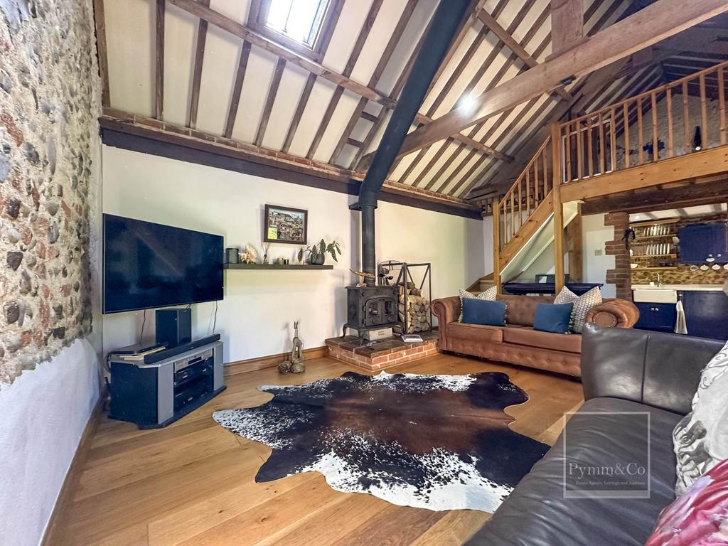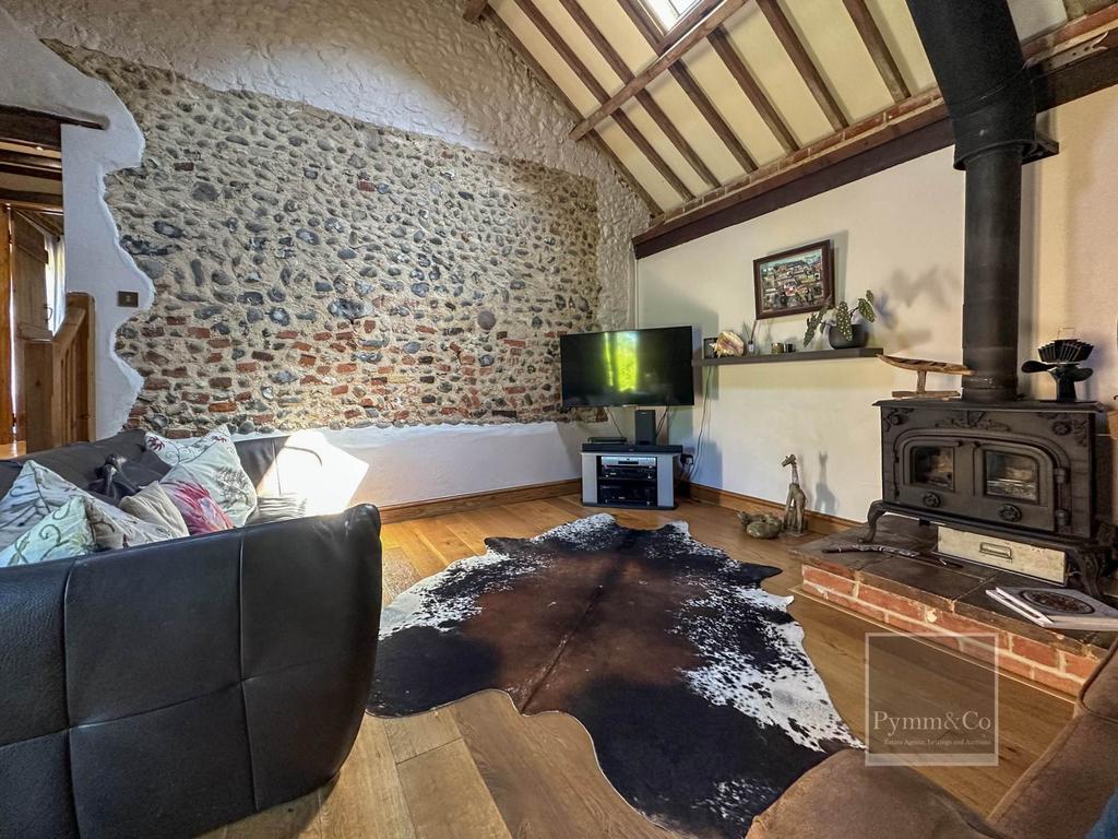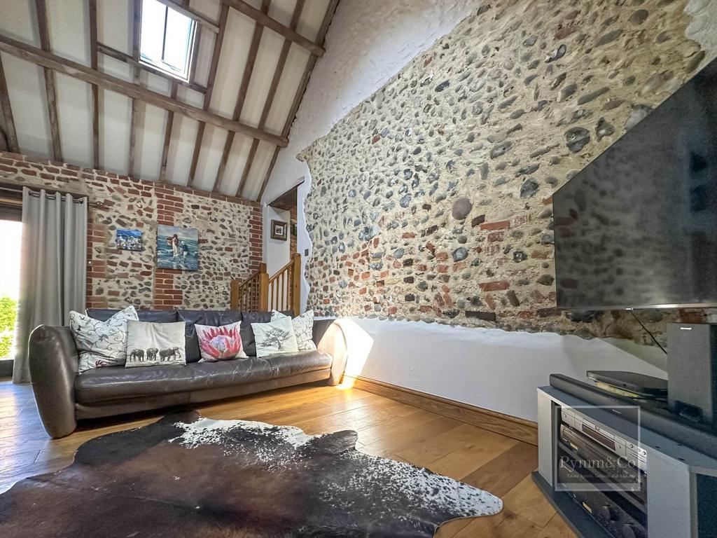 This captivating brick and flint barn conversion effortlessly blends rustic charm with contemporary comfort. Inside, vaulted ceilings with exposed beams, rich oak floors and walls of original flint create a warm, character filled living space, centred around a generous sitting and dining room with a wood burning stove and mezzanine above.