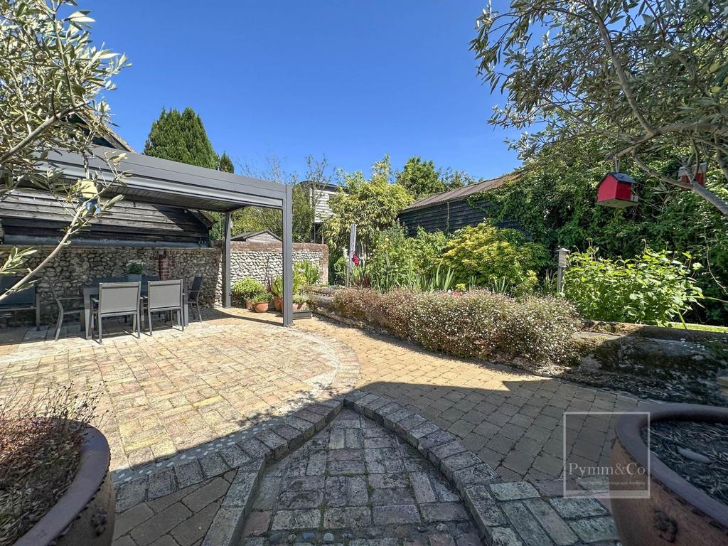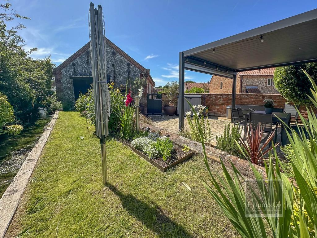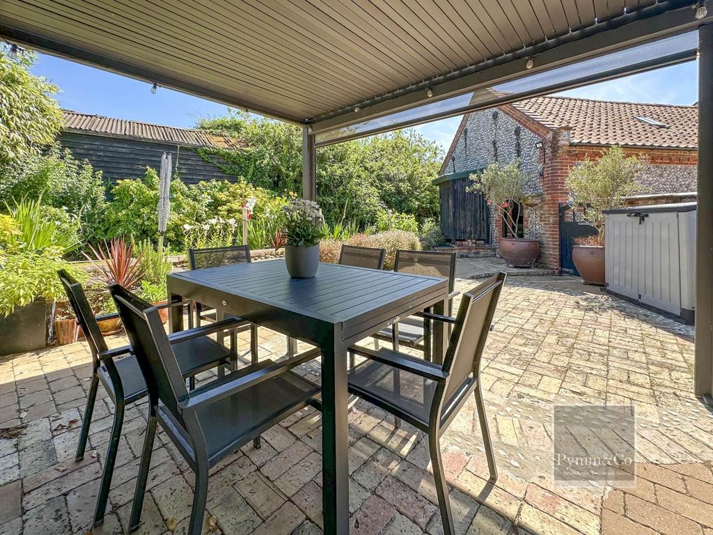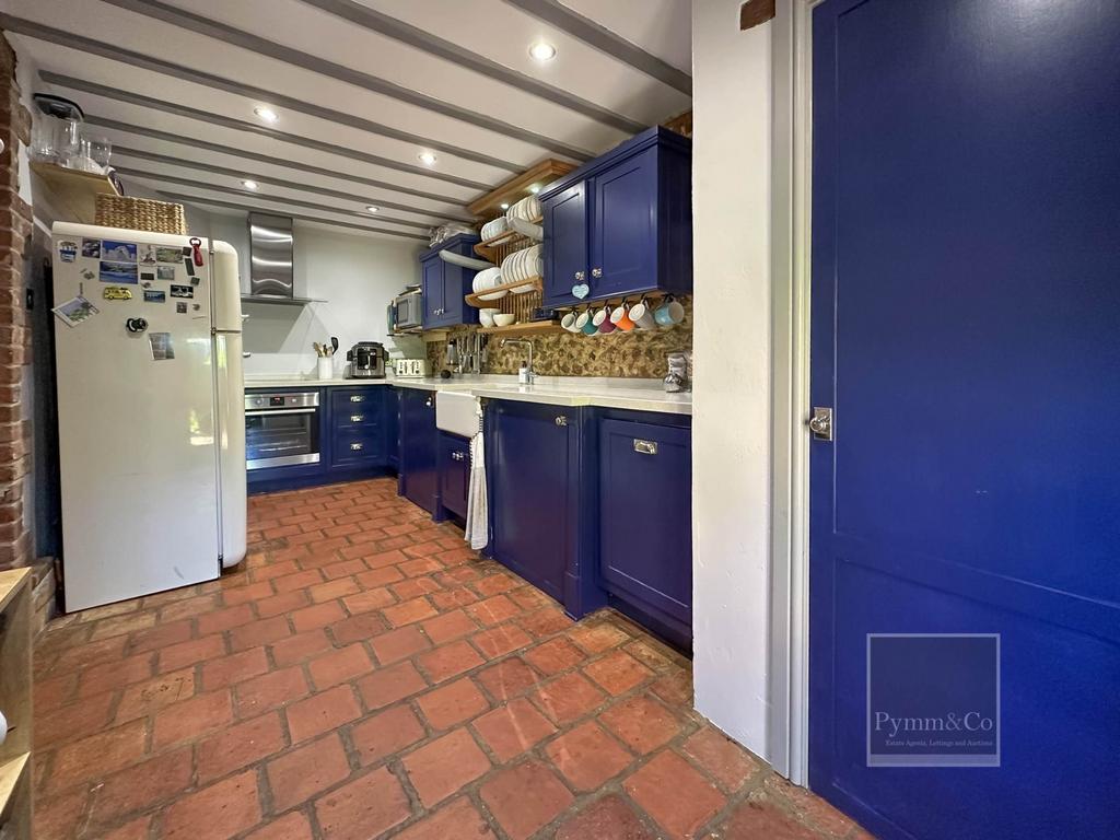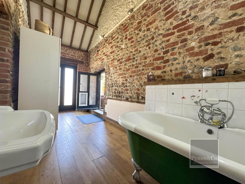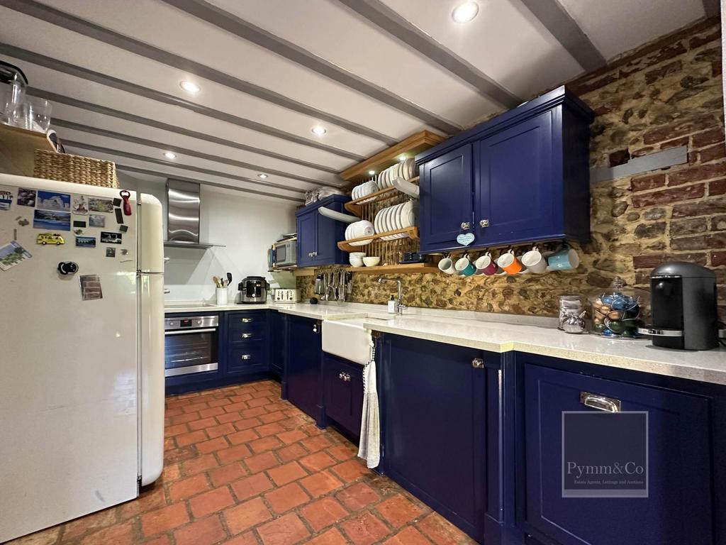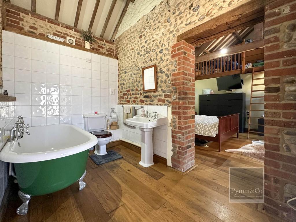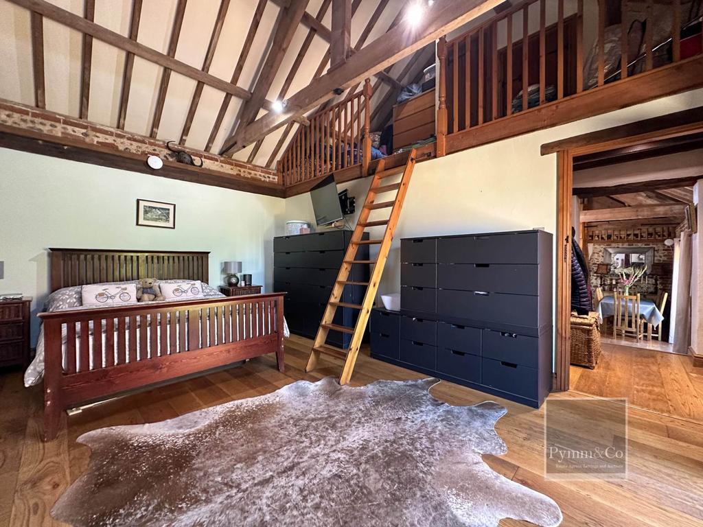 This captivating brick and flint barn conversion effortlessly blends rustic charm with contemporary comfort. Inside, vaulted ceilings with exposed beams, rich oak floors and walls of original flint create a warm, character filled living space, centred around a generous sitting and dining room with a wood burning stove and mezzanine above.