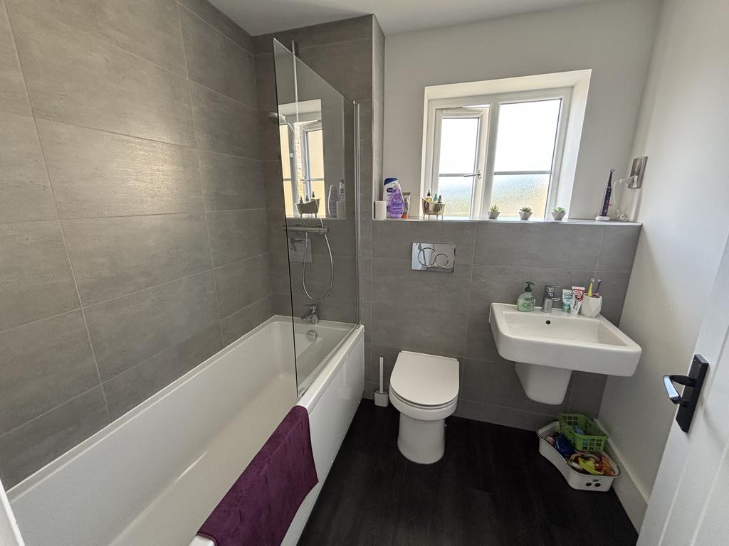 House Bathroom. 3 piece suite comprising panel bath, with shower over, pedestal hand basin and low level wc. Double glazed window, heated towel rail and extractor fan.