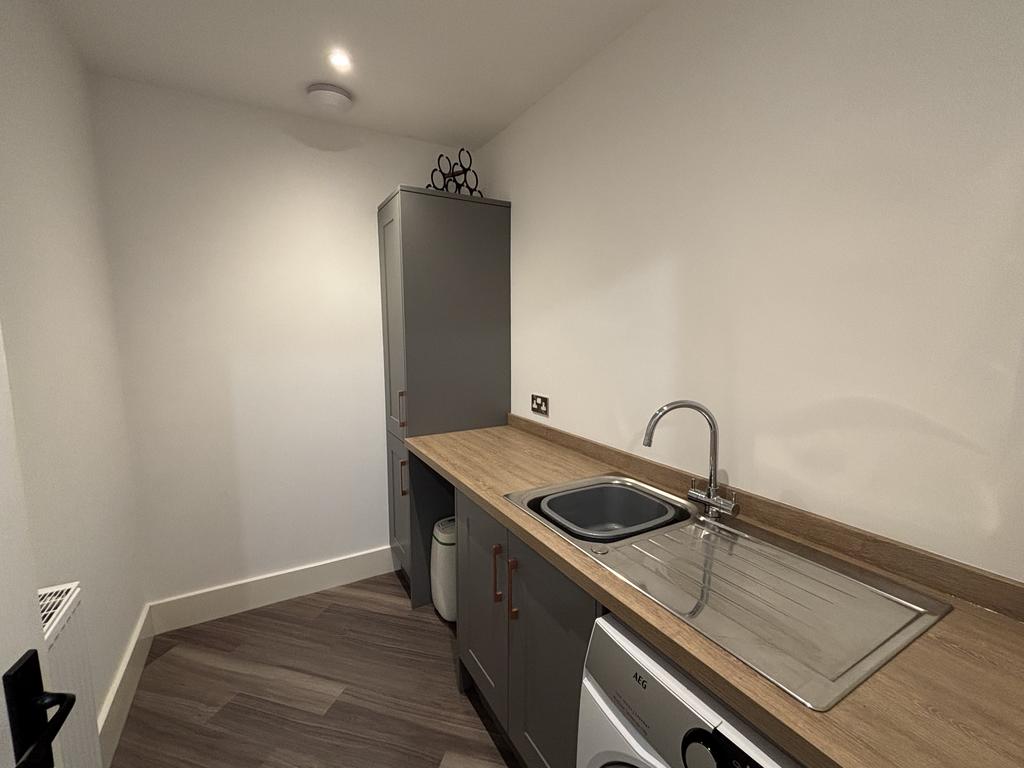 Utility Room. Having fitted base units, stainless steel sink unit with mixer taps, plumbing for washing machine and central heating radiator.