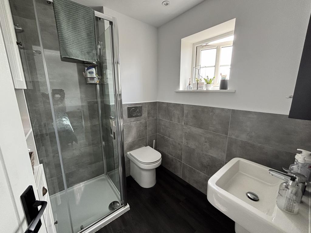 En Suite Shower Room. With shower cubicle, pedestal hand basin and low level WC. Double glazed window and heated towel rail.