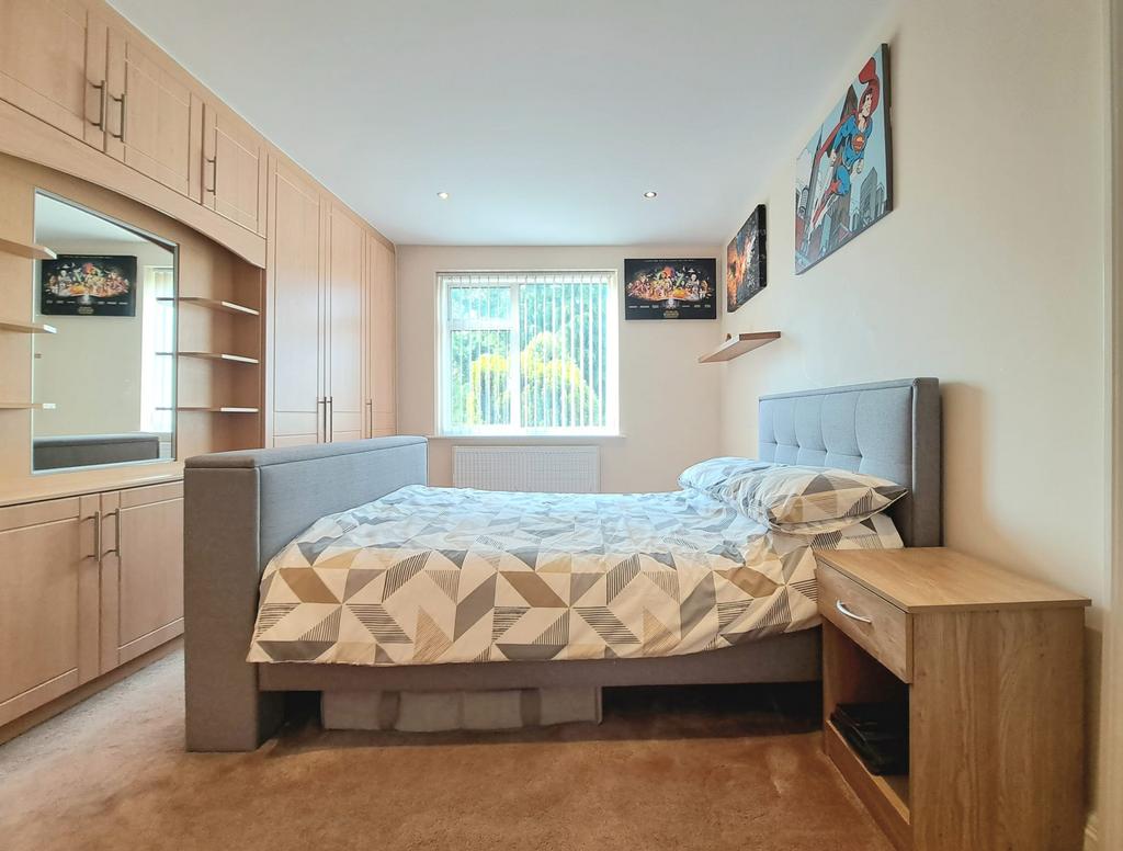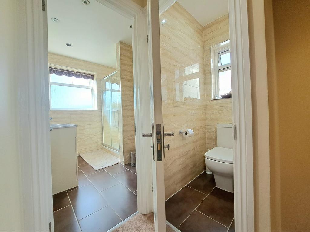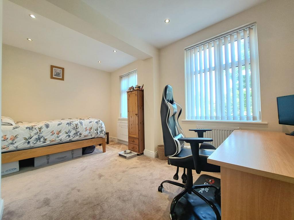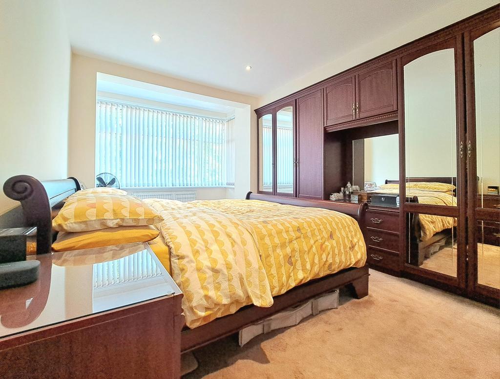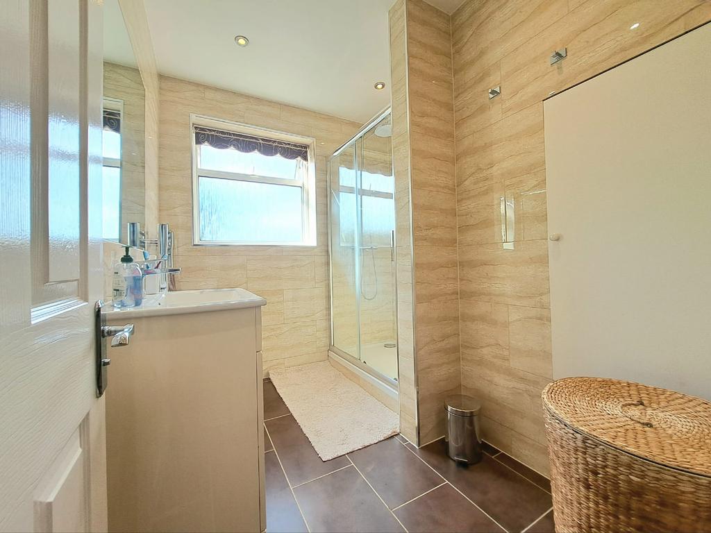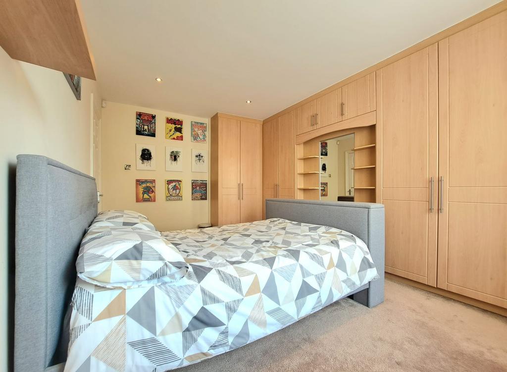 Upstairs, the property continues to impress with three generous double bedrooms. The first and second bedrooms are both equipped with fitted wardrobes, offering excellent storage without compromising on space. A modern family bathroom serves the upper floor, featuring contemporary tiling and fixtures and a double shower with sleek glass-surround. The third bedroom benefits from a walk-in wardrobe, which also presents the opportunity to be converted into an en suite bathroom (subject to relevant consents).