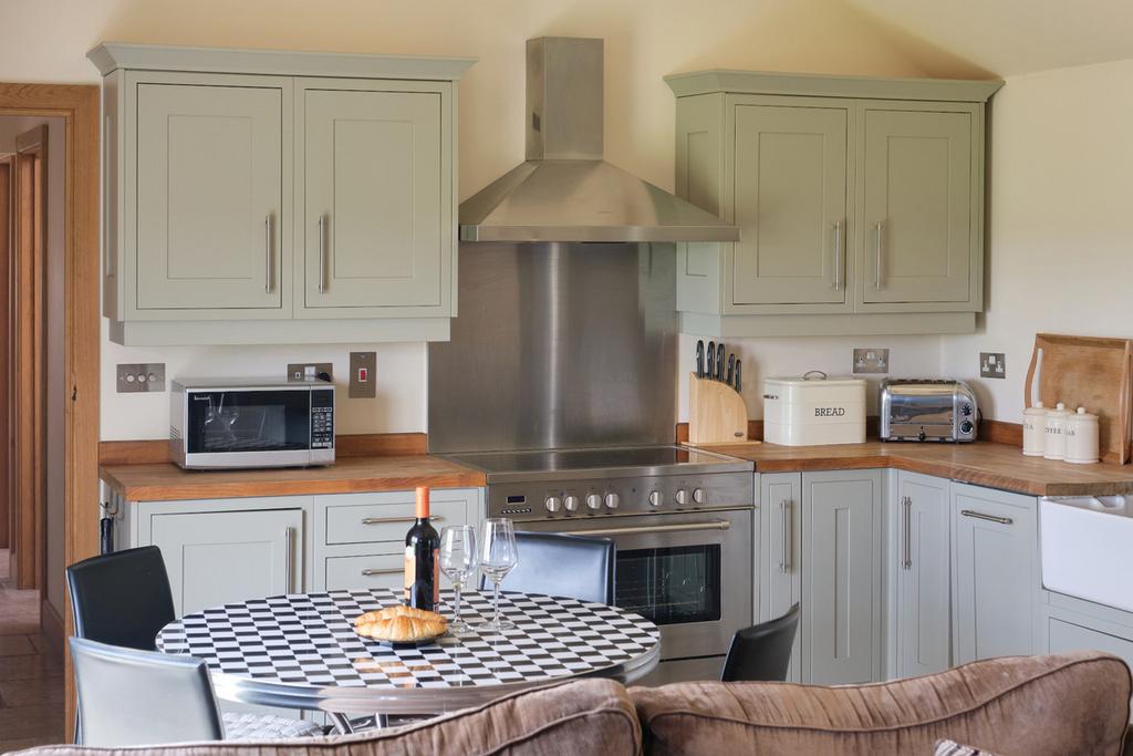 An intimate retreat for two, offering a beautifully furnished bedroom with oak features, a spacious open-plan living and dining area filled with natural light, and a well-equipped kitchen.
