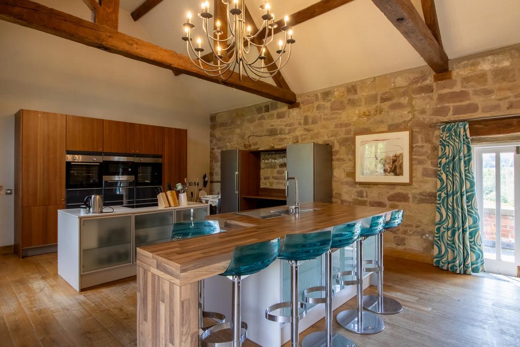 A stunning barn conversion sleeping 10 guests across five double bedrooms, each with bespoke en-suite facilities. The open-plan kitchen, dining, and lounge area boasts towering oak beams, contemporary chandeliers, and state-of-the-art kitchen appliances.