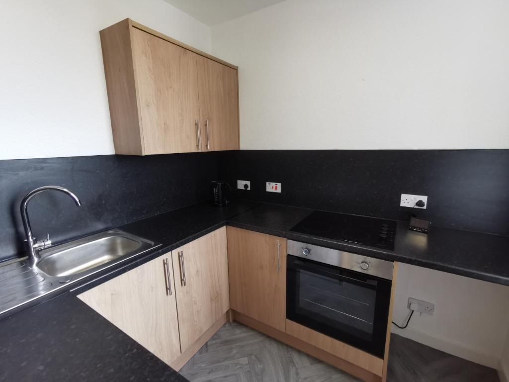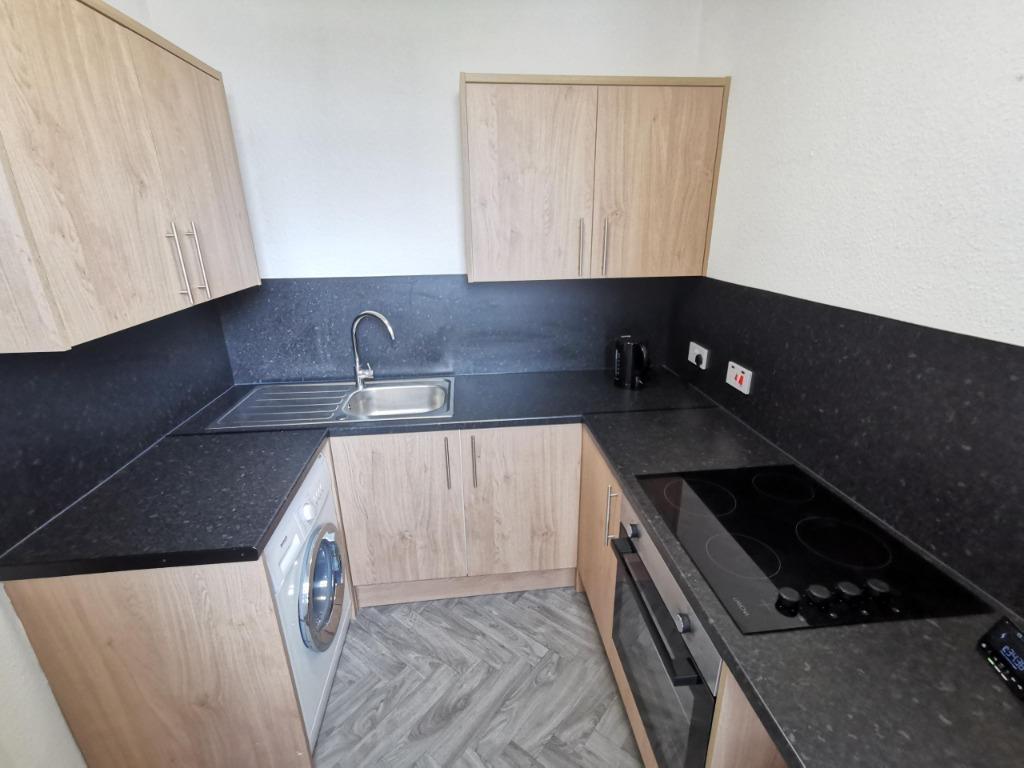 Kitchen – Modern fitted kitchen with ample wall and base units. Includes Lamona electric hob and oven, and Homark washing machine.