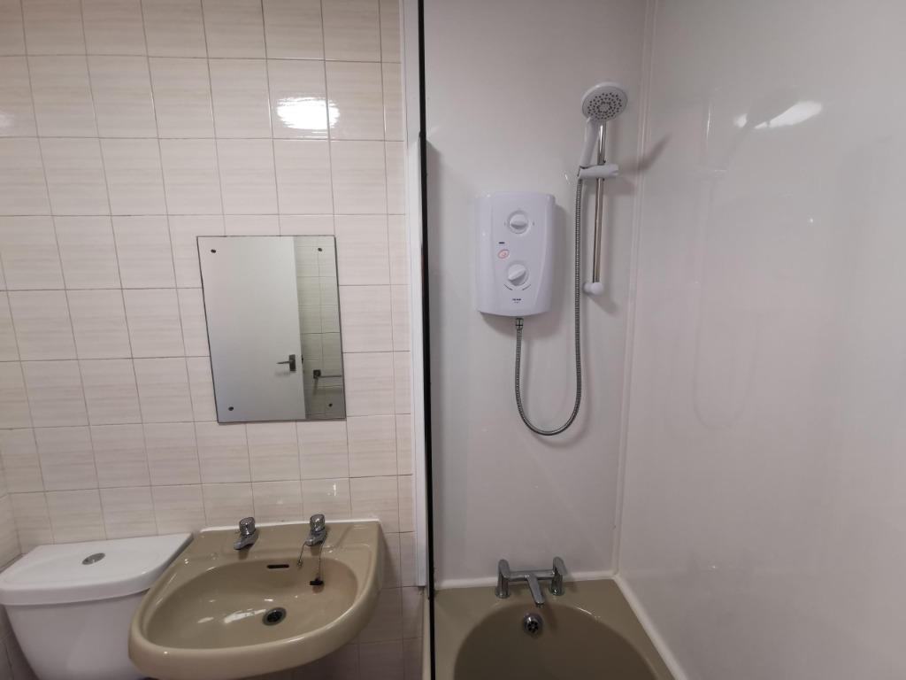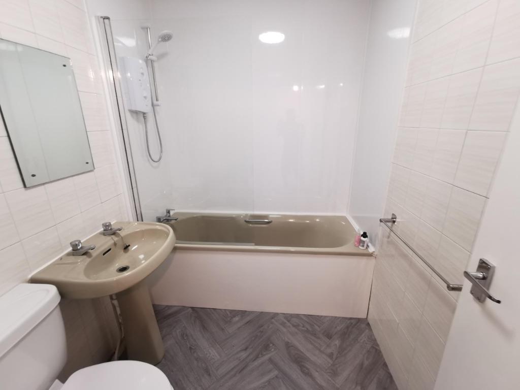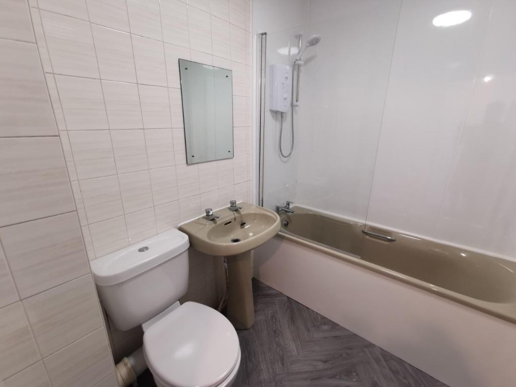 Bathroom – Modern bath/shower room with Triton electric shower over bath, wet wall and tiled surrounds, WC, and basin.
