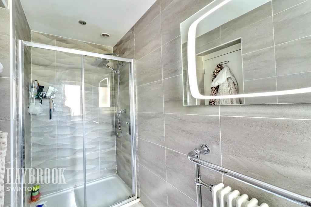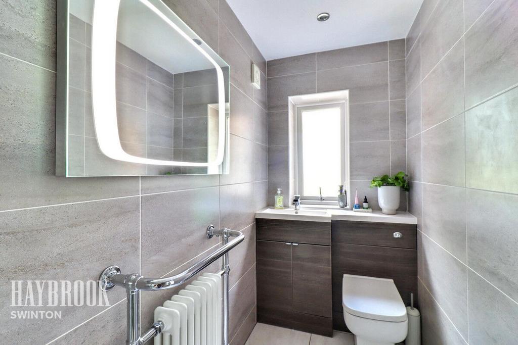 A beautifully finished en-suite, fully tiled for a sleek and modern look. It features a walk-in shower, a fitted unit with a sink and low flush toilet, and a towel radiator for added comfort. A stylish light-up mirror adds a touch of luxury, completing this practical yet elegant space.
