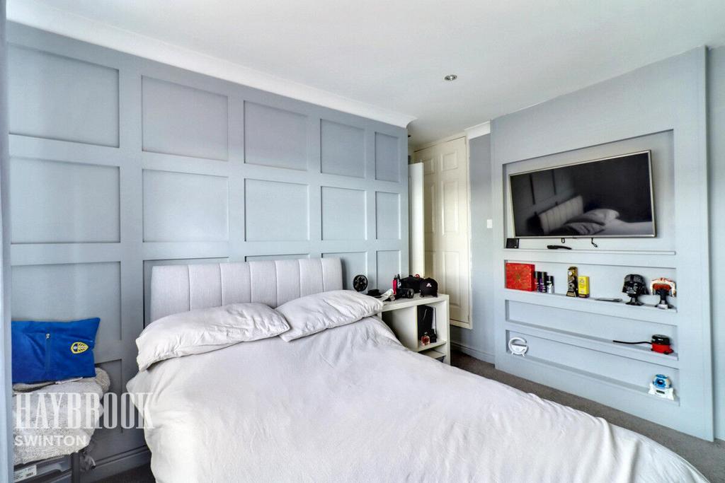 A spacious second bedroom featuring soft carpeted flooring, elegant coving, and a front-facing double-glazed window that fills the room with natural light. The room also includes built-in wardrobes for ample storage and a stylish media wall, making it perfect for relaxation or entertainment.