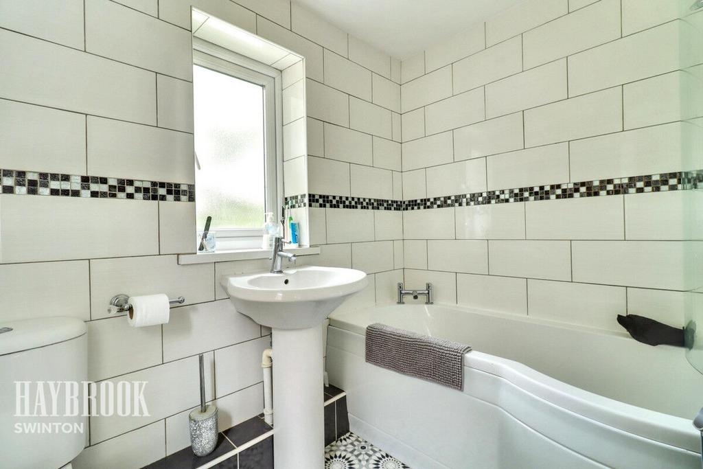 A well-appointed family bathroom featuring rear and side-facing double-glazed windows that allow plenty of natural light. The space is fully tiled for a sleek finish and includes a bath with an overhead shower, a sink, and a toilet, offering both functionality and style.