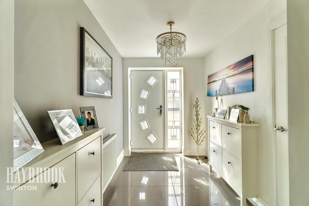 A spacious and welcoming entrance hall featuring a stylish tiled floor, a modern UPVC front door allowing natural light to flow in, and a central radiator providing warmth and comfort.