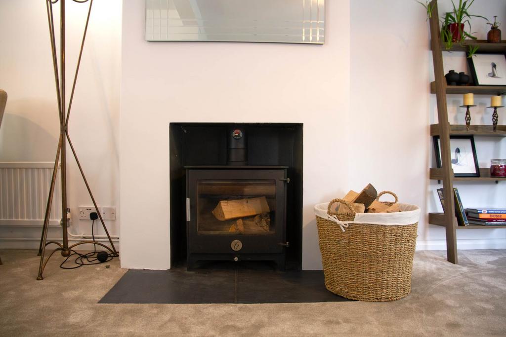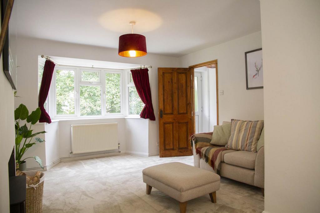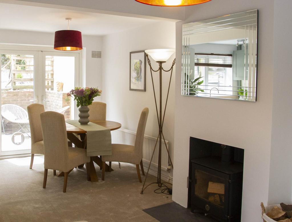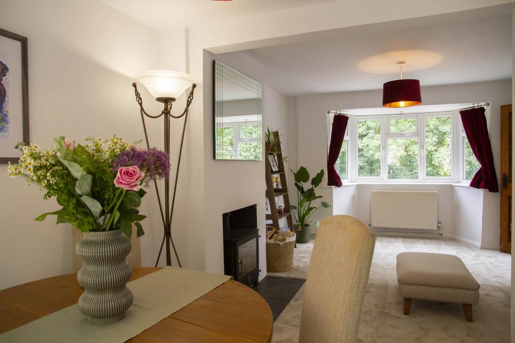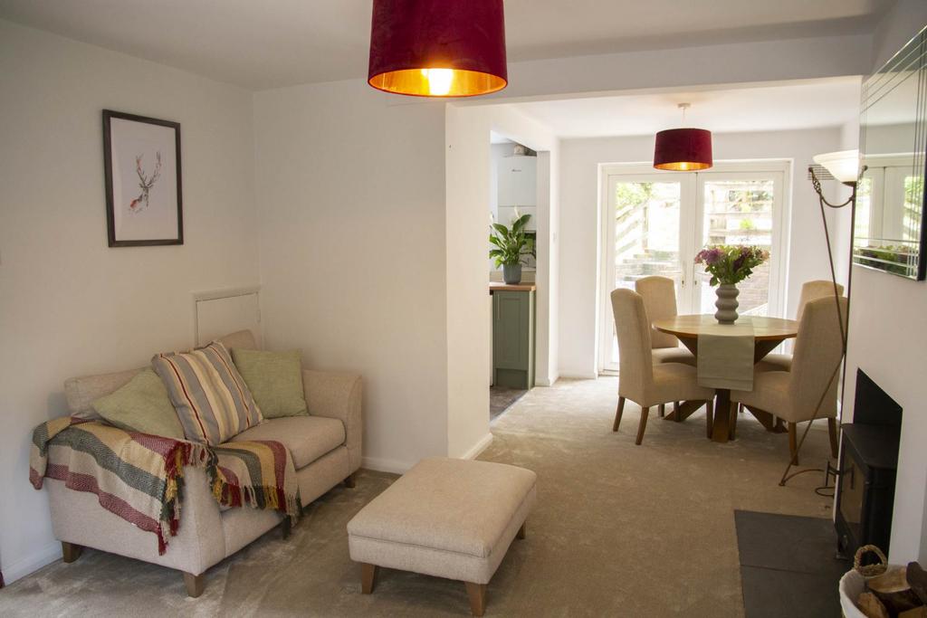 22'8 x 12'3. uPVC double glazed bay window looking to Winterbourne Close and trees. Fireplace with cast iron wood-burner and slate tiled hearth. Cupboard understairs. Radiator. uPVC double glazed doors to rear garden and south facing patio. Arch to:-