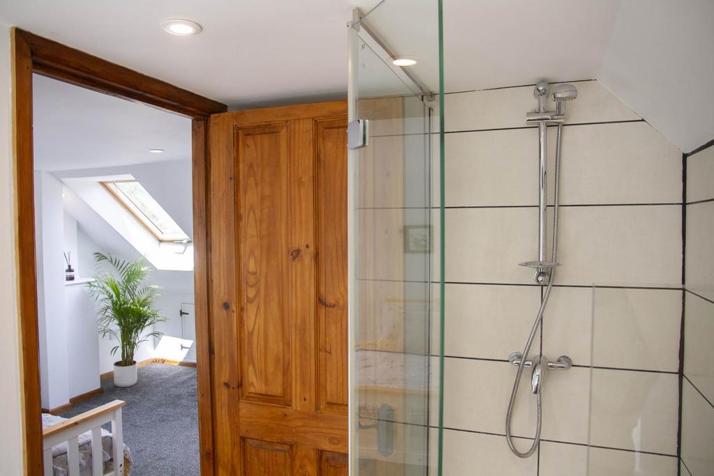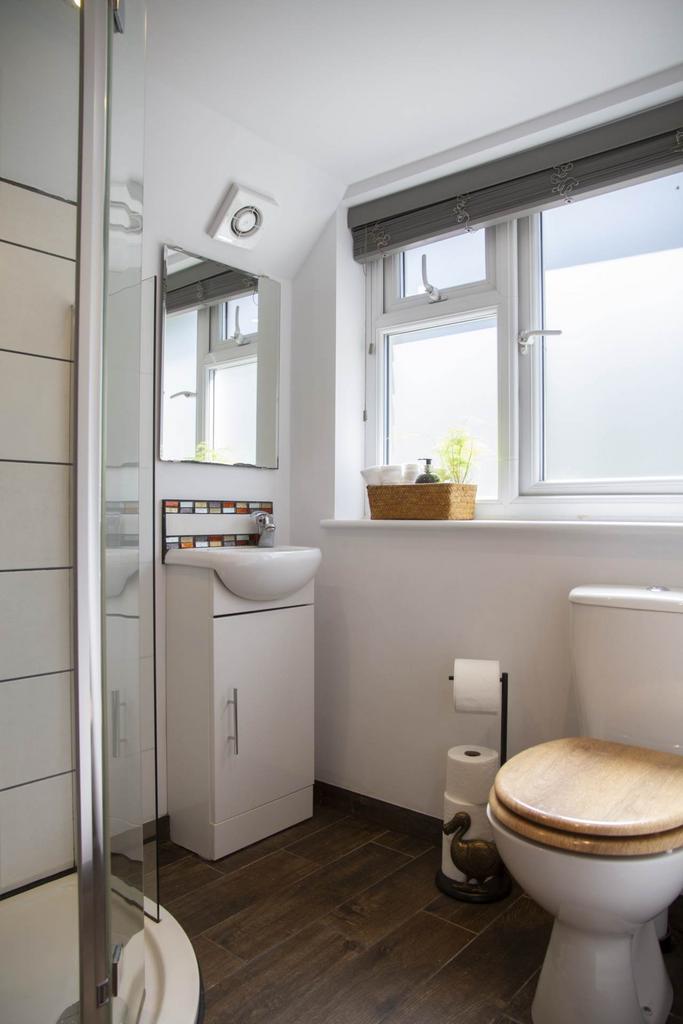7'6 x 5'. uPVC double glazed window. Walk-in shower with folding glazed door and tiled walls with mosaic band and shelf top. Low level w.c. Wash basin with mosaic tiled splashback, mixer tap and cupboard under. Chrome ladder towel rail. Extractor fan. Recessed spotlighting.