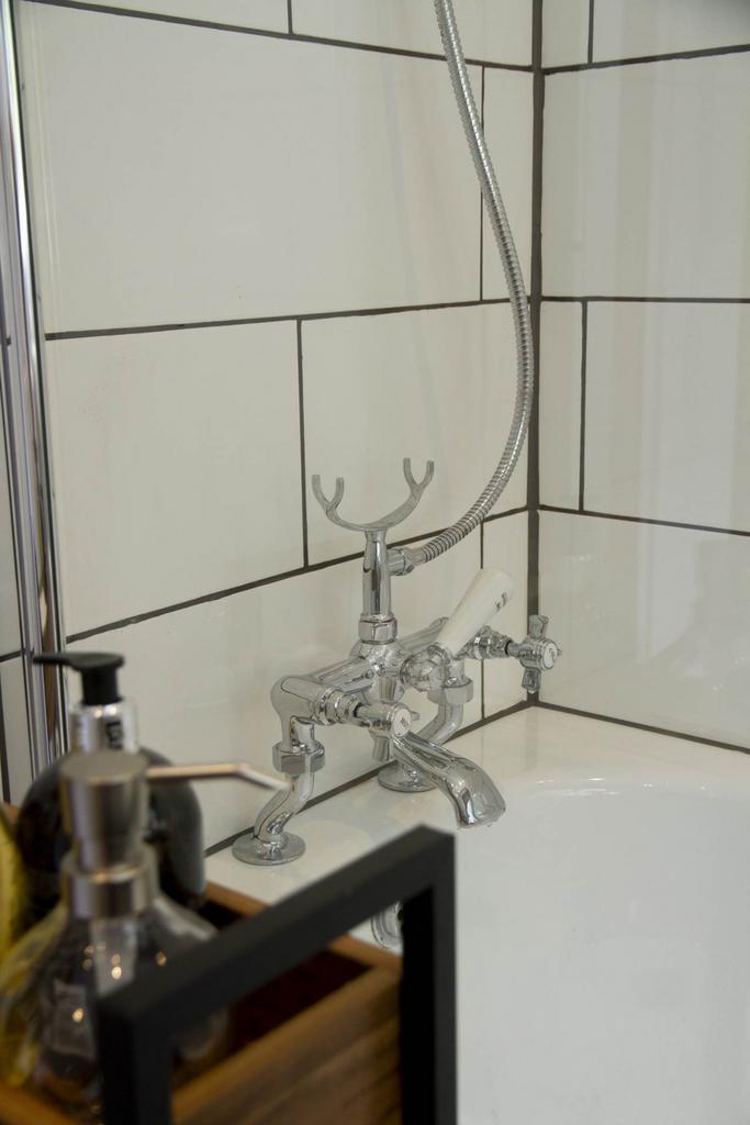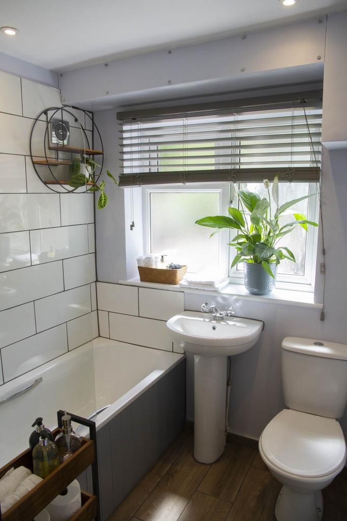 6'1 x 6'. uPVC double glazed frosted window. Wood panelled bath with hand grips, mixer taps and shower attachment. Glazed shower panel. Tiled bath area. Pedestal wash basin. Low level w.c. Radiator. Extractor fan. Tiled floor. Recessed spotlighting. Exposed wood door and architrave.