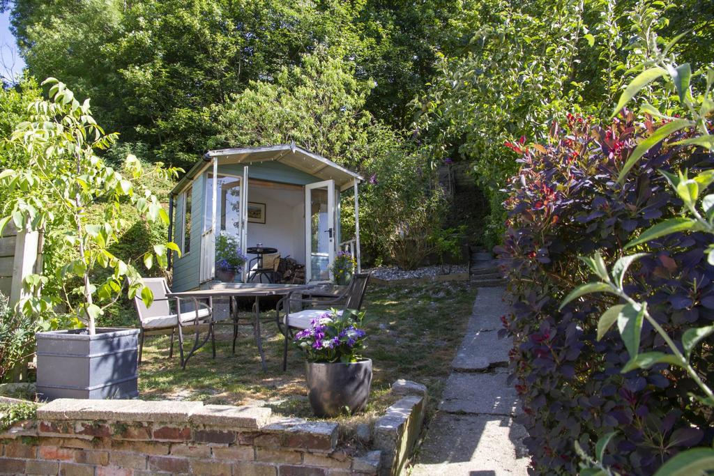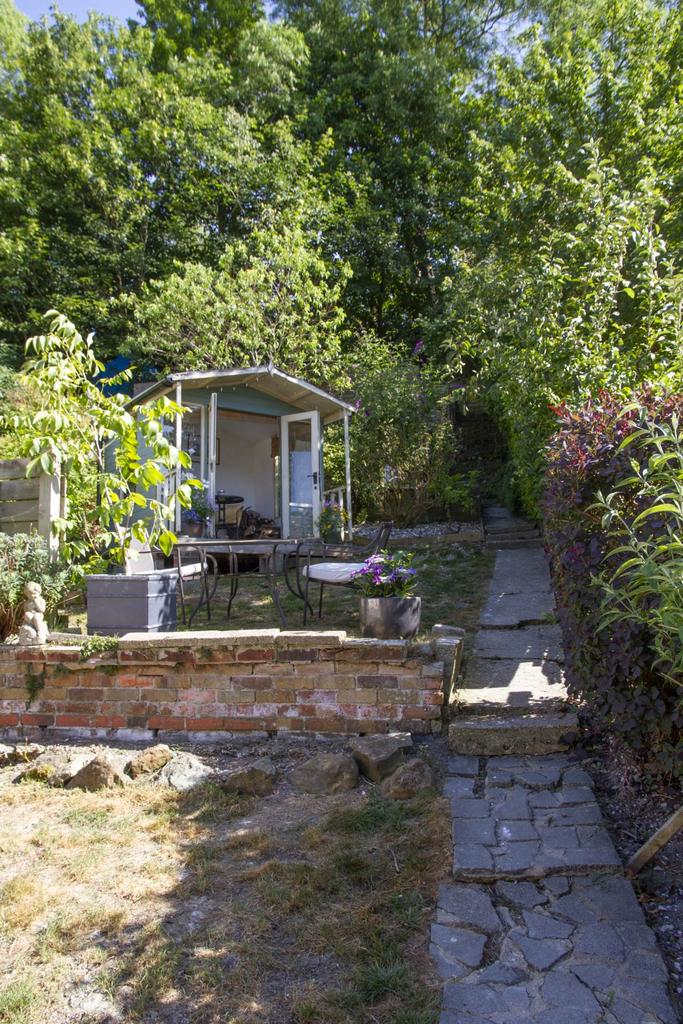 Approximately 100' depth. Crazy-paved south facing patio with awning, outside light and water tap. Brick steps and crazy-paved pathway to lawn and further second level lawned area. Summerhouse, 8' x 6'2, with front deck. Shaped bed and pathway leading to further lawned section and steps to gate to Love Lane with bank to side. Gate to tarmac driveway leading to:-
