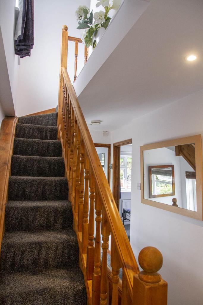 Frosted uPVC double glazed window. Pine hand rail and railings with stairs leading to first floor landing.
