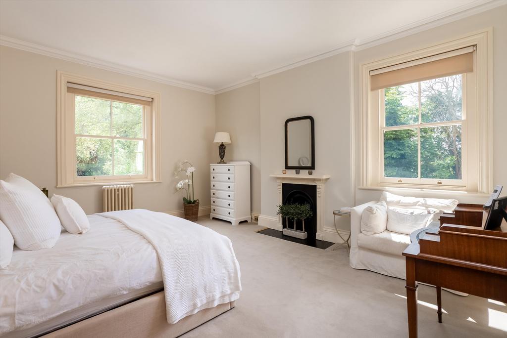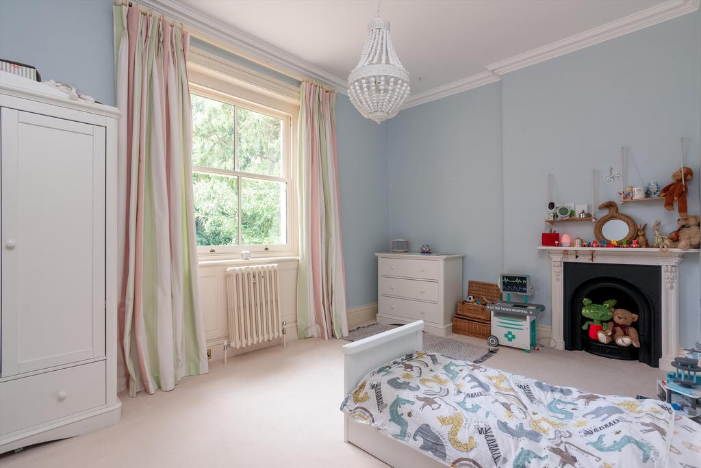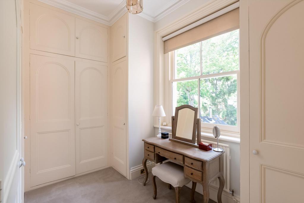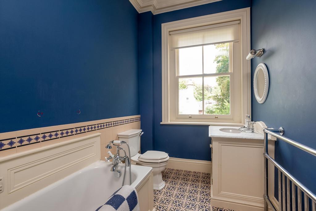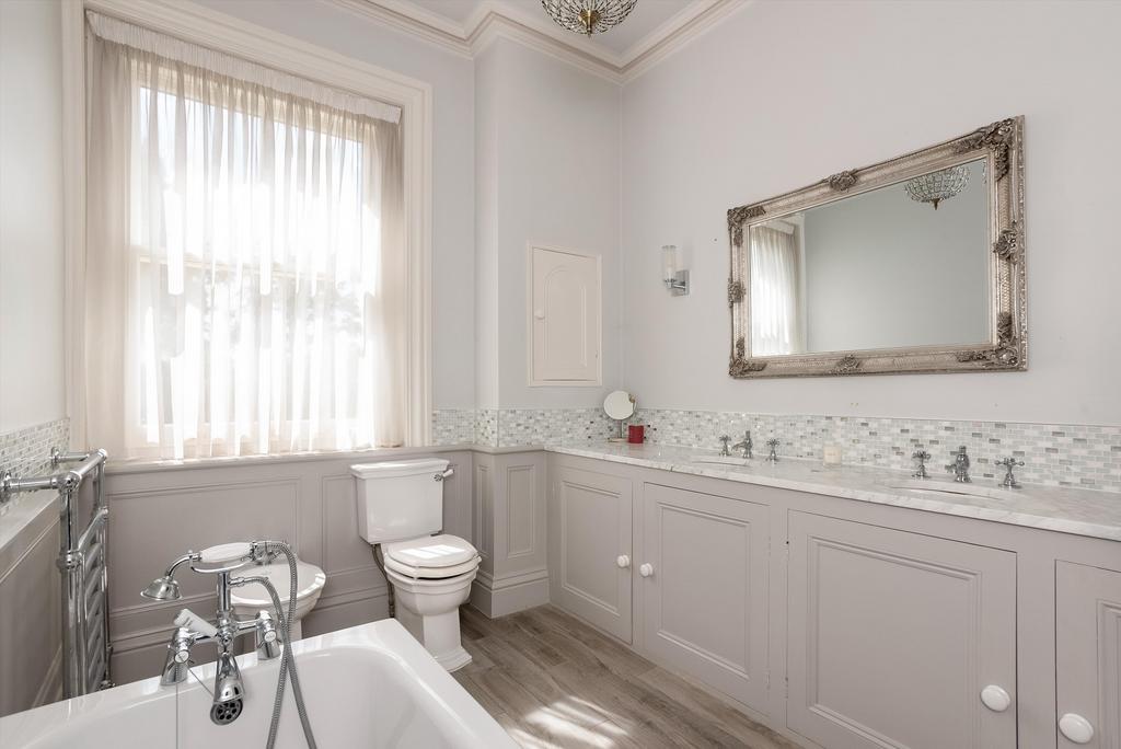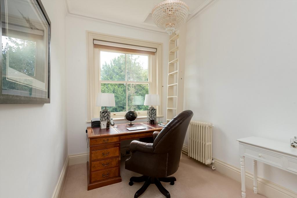 To the first floor, bedrooms have cast iron fireplaces. Off the half-landing is a laundry, closet and cloakroom. Off the main landing is a study with fitted furniture and shelves. Principal bedroom with dressing room with ample wardrobes, en suite bathroom with twin basins and vanity unit with marble top. Two further fine double bedrooms and family bathroom.