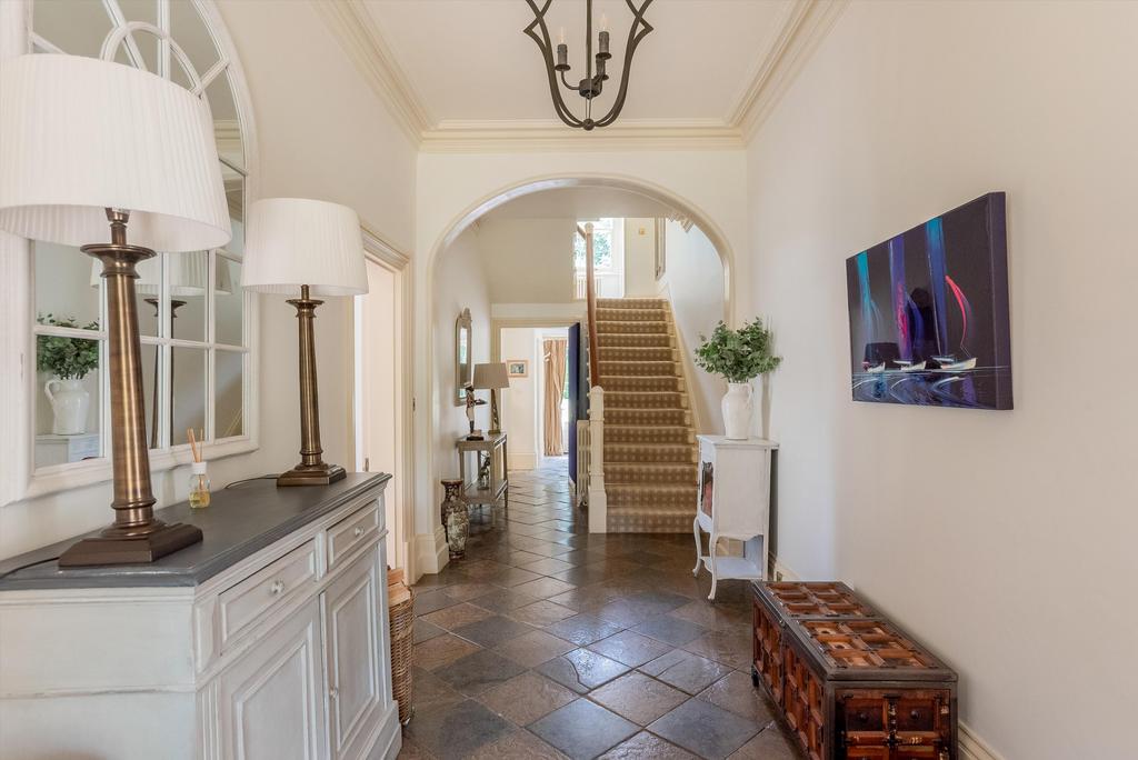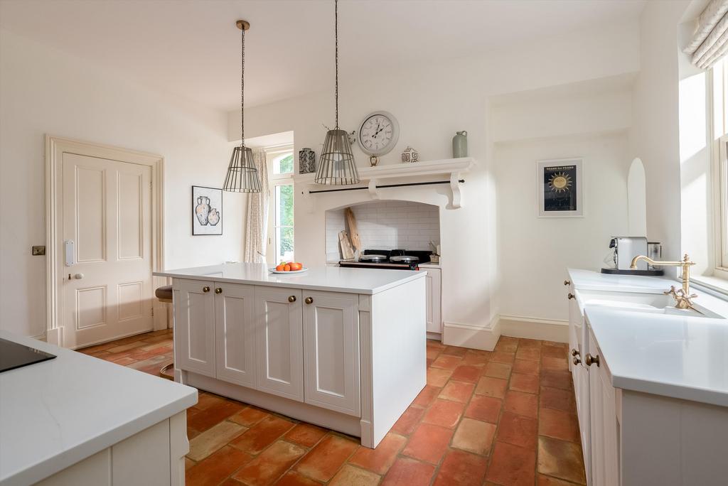 The diamond pattern flagstone reception hall with Georgian arch runs the depth of the house, with a cloakroom off with limestone tiled floor and fine staircase with cast iron bannisters and oak handrail. Drawing room facing south and east with wood-burning stove and double doors opening to the dining room, which has fitted shelves. Sitting room, facing south and west, with door to the garden terrace and opens to the kitchen/breakfast room which is fitted with Shaker style kitchen fittings, two oven Aga, electric oven, grill and extractor, with a door to the garden. Useful cool pantry with marble cold shelf and boot room. Garden room, currently used as a playroom, south east and west-facing, with double doors to outside. Wine cellar with lias stone walls, extractor and sump pump.