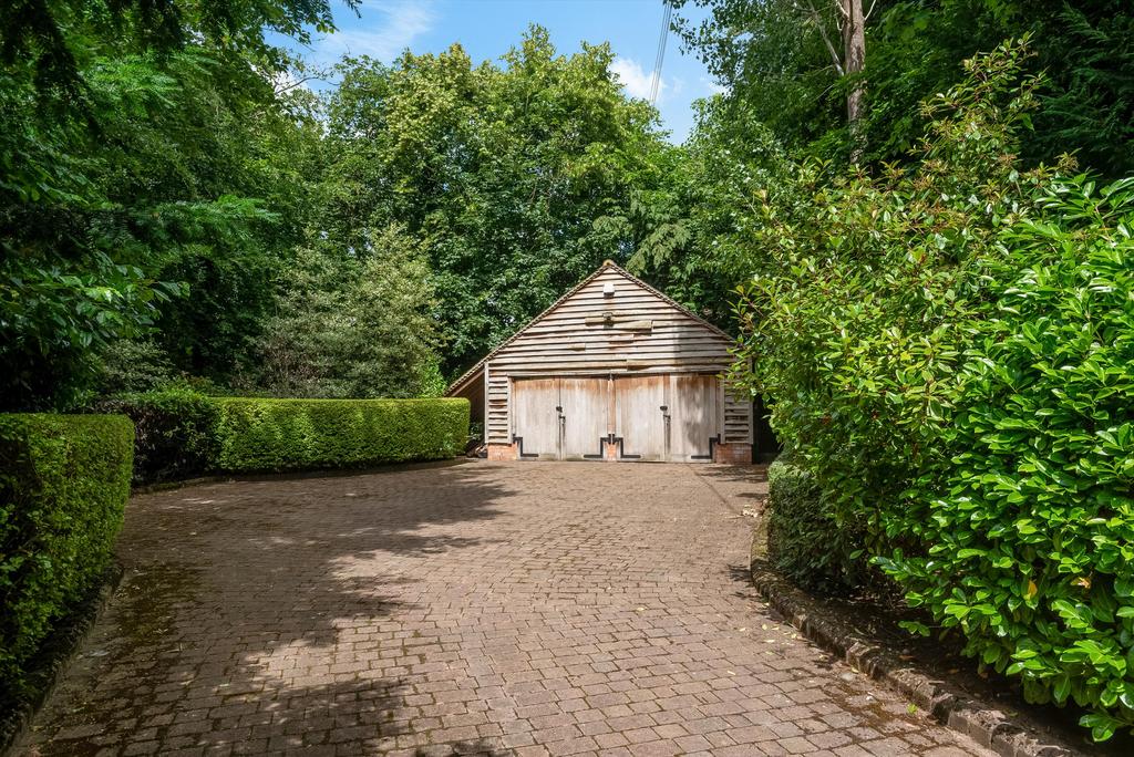Behind the house is a large flagstone patio with edged block paved path with lighting, with shrub, herbaceous and bulb borders to one side, leading to the oak-framed double garage, built in 2009, with alarm, oak cladding and log store and electric car charger point. The garage is accessed by a block-paved back drive with double wooden gates and parking area.