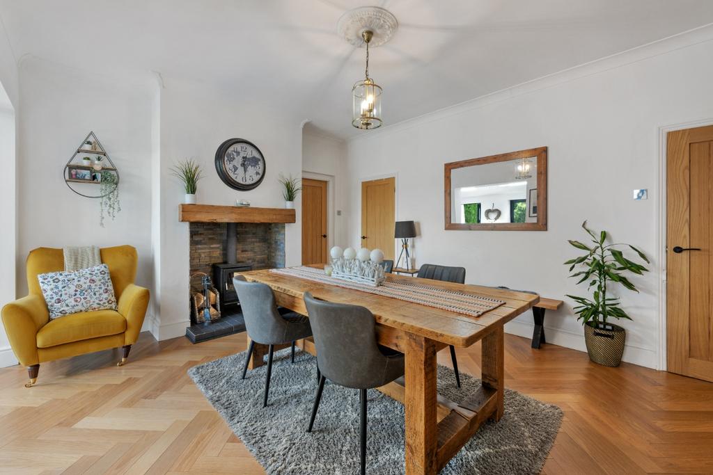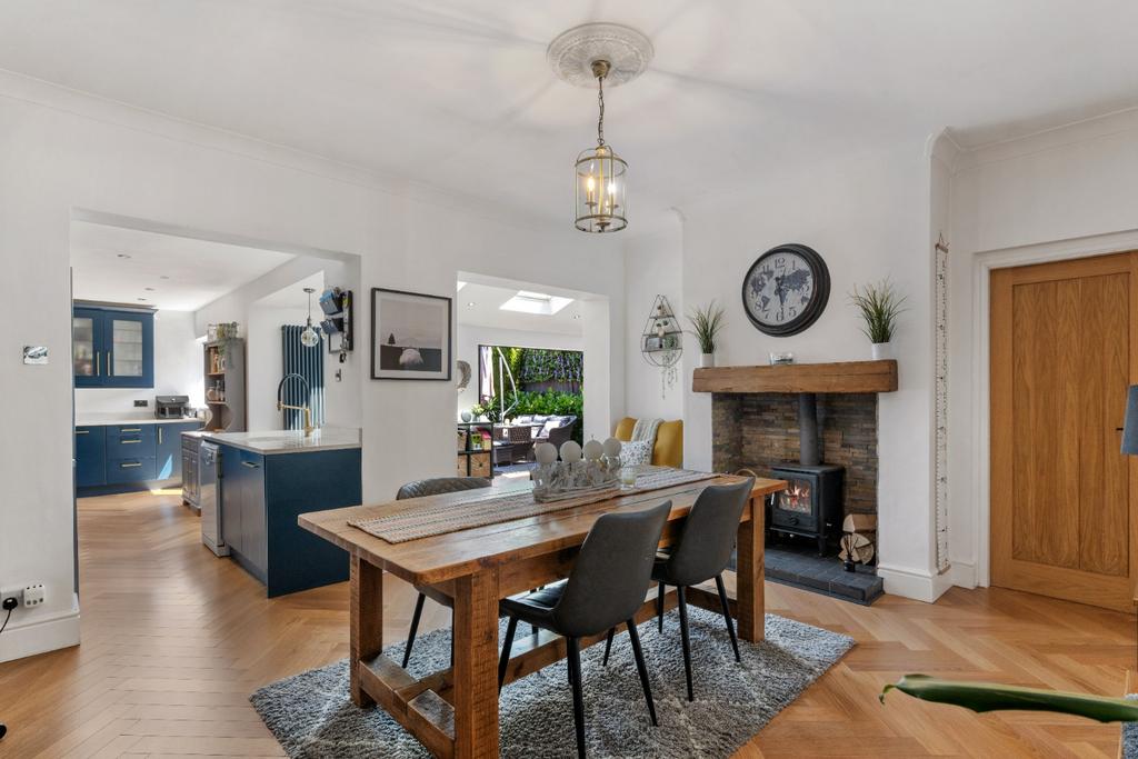 The heart of this home is undoubtedly the magnificent open-plan kitchen and family room. This expansive area is a true showstopper, featuring a beautifully appointed kitchen that will inspire any culinary enthusiast. Including high-quality fixtures, integrated appliances, and plenty of storage, it seamlessly flows into a spacious dining and family area, creating a vibrant hub for daily life and entertaining. The log burner adds to the character of this space and the bi-fold doors seamless connection to the outdoors, blurring the lines between indoor and outdoor living and flooding the space with natural light.