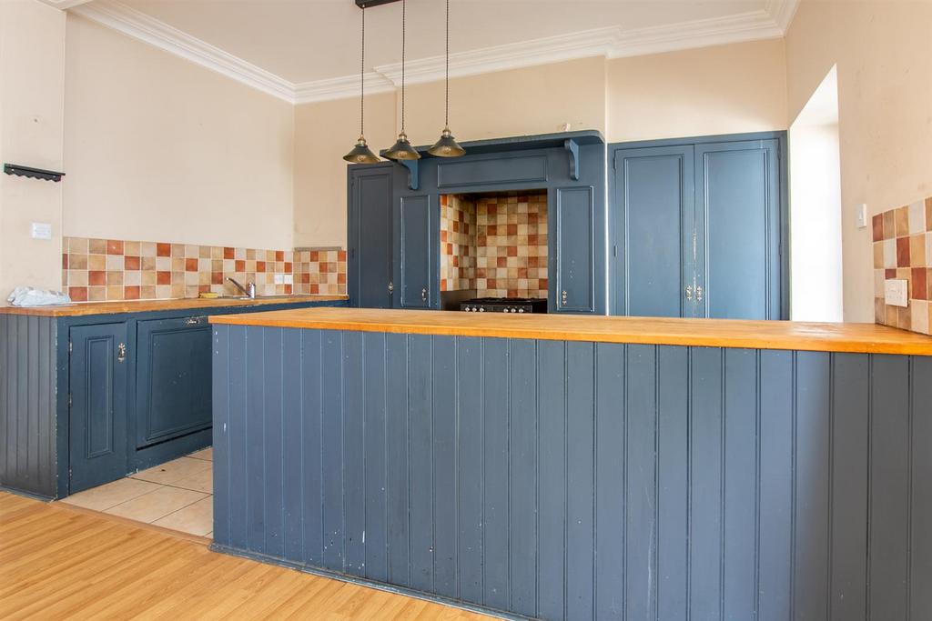 Kitchen/Dining Room - 5.28m plus recess x 4.17m (5.70m in to bay) (17'3" - Sash bay window to rear aspect and sash window to side. French doors leading to the rear terrace. Fitted units with solid wood work tops, inset stainless steel single bowl sink unit with mixer tap, integrated dishwasher, fridge and freezer. The kitchen is in need of refurbishment.