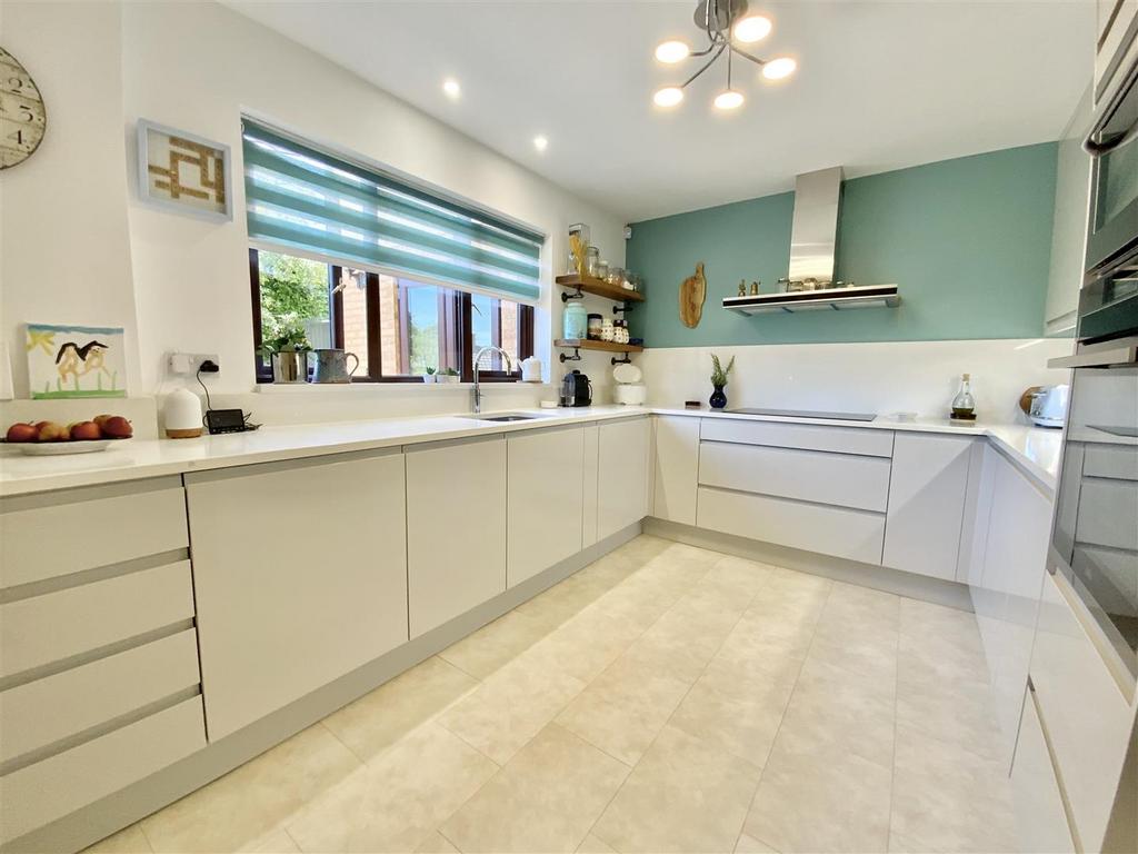 The kitchen has a modern range of handleless units to floor and wall levels to include drawers. Quartz worktops with an under mounted sink with Quooker boiling tap, wired induction hob, extractor hood and double ovens. Integrated dishwasher window to the side, tiled floor and a door to the utility room.